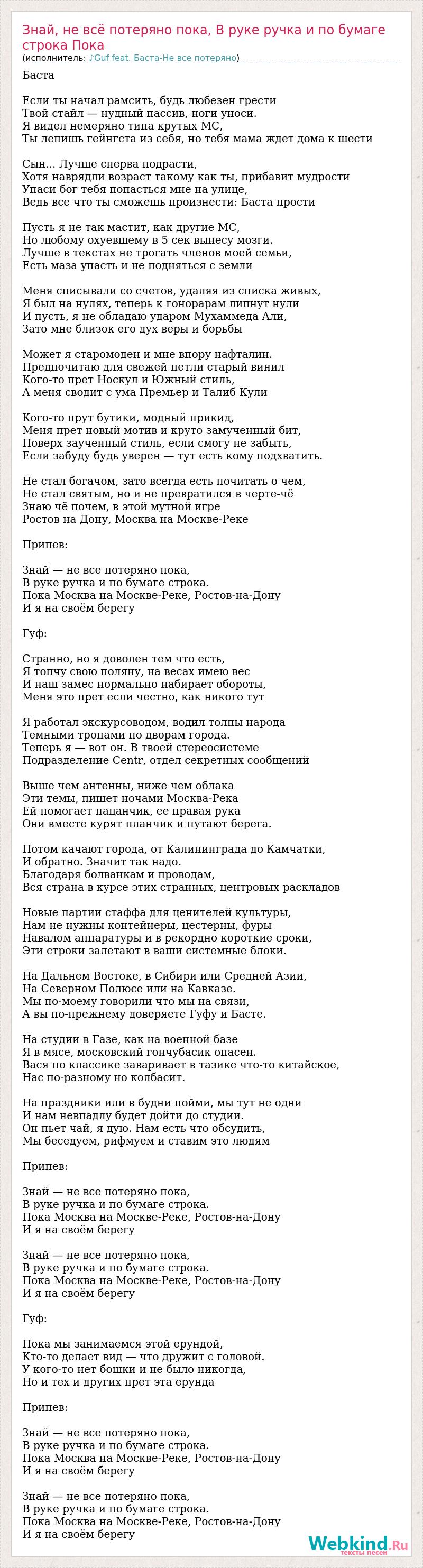 Баста Если ты начал рамсить, будь любезен грести Твой стайл — нудный пассив, ноги уноси. Я видел немеряно типа крутых MC, Ты лепишь гейнгста из себя, но тебя мама ждет дома к шести Сын... Лучше сперва подрасти, Хотя наврядли возраст такому как ты, прибавит мудрости Упаси бог тебя попасться мне на улице, Ведь все что ты сможешь произнести: Баста прости Пусть я не так мастит, как другие MC, Но любому охуевшему в 5 сек вынесу мозги. Лучше в текстах не трогать членов моей семьи, Есть маза упасть и не подняться с земли Меня списывали со счетов, удаляя из списка живых, Я был на нулях, теперь к гонорарам липнут нули И пусть, я не обладаю ударом Мухаммеда Али, Зато мне близок его дух веры и борьбы Может я старомоден и мне впору нафталин. Предпочитаю для свежей петли старый винил Кого-то прет Носкул и Южный стиль, А меня сводит с ума Премьер и Талиб Кули Кого-то прут бутики, модный прикид, Меня прет новый мотив и круто замученный бит, Поверх заученный стиль, если смогу не забыть, Если забуду будь уверен — тут есть кому подхватить. Не стал богачом, зато всегда есть почитать о чем, Не стал святым, но и не превратился в черте-чё Знаю чё почем, в этой мутной игре Ростов на Дону, Москва на Москве-Реке Припев: Знай — не все потеряно пока, В руке ручка и по бумаге строка. Пока Москва на Москве-Реке, Ростов-на-Дону И я на своём берегу Гуф: Странно, но я доволен тем что есть, Я топчу свою поляну, на весах имею вес И наш замес нормально набирает обороты, Меня это прет если честно, как никого тут Я работал экскурсоводом, водил толпы народа Темными тропами по дворам города. Теперь я — вот он. В твоей стереосистеме Подразделение Centr, отдел секретных сообщений Выше чем антенны, ниже чем облака Эти темы, пишет ночами Москва-Река Ей помогает пацанчик, ее правая рука Они вместе курят планчик и путают берега. Потом качают города, от Калининграда до Камчатки, И обратно. Значит так надо. Благодаря болванкам и проводам, Вся страна в курсе этих странных, центровых раскладов Новые партии стаффа для ценителей культуры, Нам не нужны контейнеры, цестерны, фуры Навалом аппаратуры и в рекордно короткие сроки, Эти строки залетают в ваши системные блоки. На Дальнем Востоке, в Сибири или Средней Азии, На Северном Полюсе или на Кавказе. Мы по-моему говорили что мы на связи, А вы по-прежнему доверяете Гуфу и Басте. На студии в Газе, как на военной базе Я в мясе, московский гончубасик опасен. Вася по классике заваривает в тазике что-то китайское, Нас по-разному но колбасит. На праздники или в будни пойми, мы тут не одни И нам невпадлу будет дойти до студии. Он пьет чай, я дую. Нам есть что обсудить, Мы беседуем, рифмуем и ставим это людям Припев: Знай — не все потеряно пока, В руке ручка и по бумаге строка. Пока Москва на Москве-Реке, Ростов-на-Дону И я на своём берегу Знай — не все потеряно пока, В руке ручка и по бумаге строка. Пока Москва на Москве-Реке, Ростов-на-Дону И я на своём берегу Гуф: Пока мы занимаемся этой ерундой, Кто-то делает вид — что дружит с головой. У кого-то нет бошки и не было никогда, Но и тех и других прет эта ерунда Припев: Знай — не все потеряно пока, В руке ручка и по бумаге строка. Пока Москва на Москве-Реке, Ростов-на-Дону И я на своём берегу Знай — не все потеряно пока, В руке ручка и по бумаге строка. Пока Москва на Москве-Реке, Ростов-на-Дону И я на своём берегу