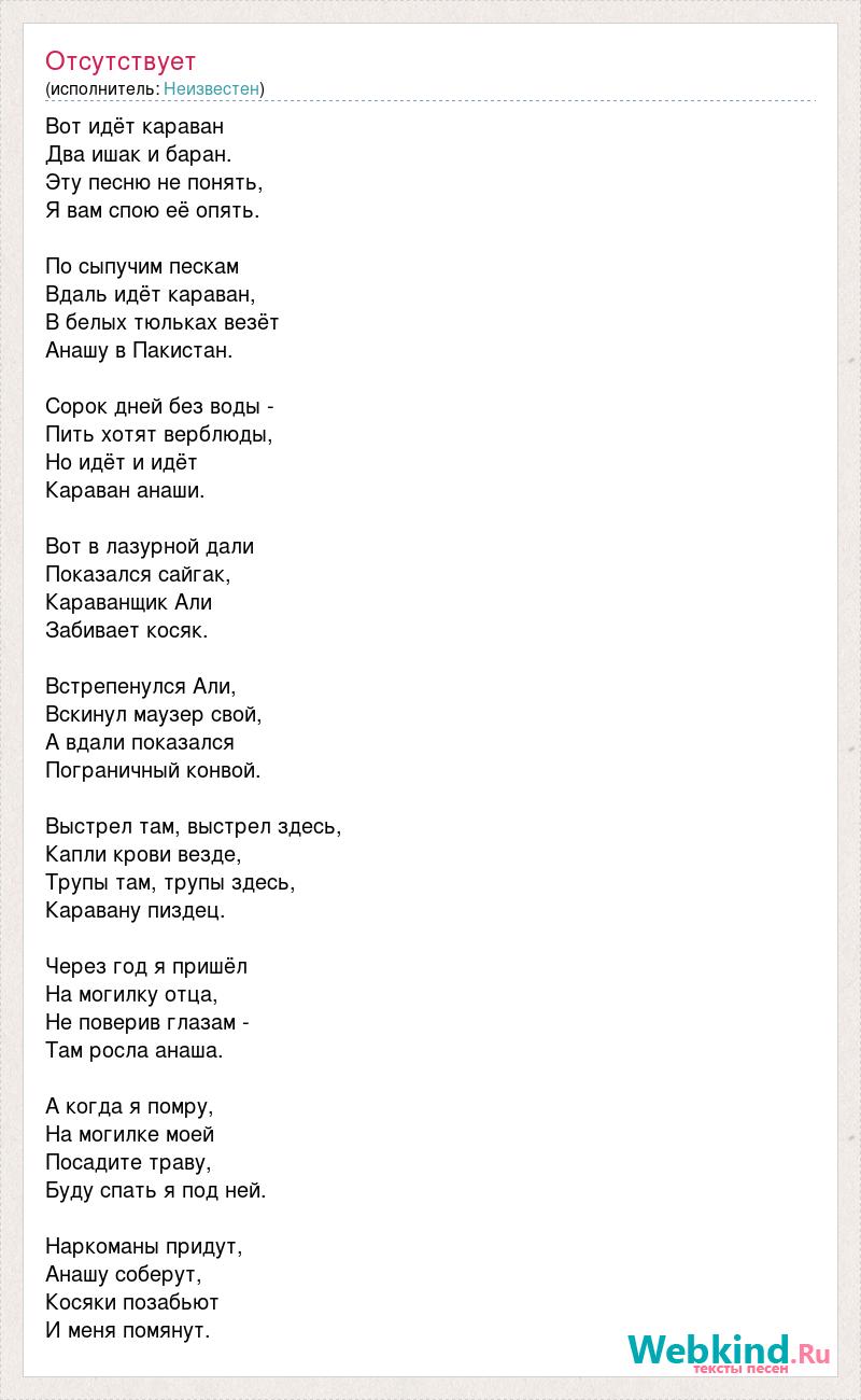 Вот идёт караван Два ишак и баран. Эту песню не понять, Я вам спою её опять. По сыпучим пескам Вдаль идёт караван, В белых тюльках везёт Анашу в Пакистан. Сорок дней без воды - Пить хотят верблюды, Но идёт и идёт Караван анаши. Вот в лазурной дали Показался сайгак, Караванщик Али Забивает косяк. Встрепенулся Али, Вскинул маузер свой, А вдали показался Пограничный конвой. Выстрел там, выстрел здесь, Капли крови везде, Трупы там, трупы здесь, Каравану пиздец. Через год я пришёл На могилку отца, Не поверив глазам - Там росла анаша. А когда я помру, На могилке моей Посадите траву, Буду спать я под ней. Наркоманы придут, Анашу соберут, Косяки позабьют И меня помянут.