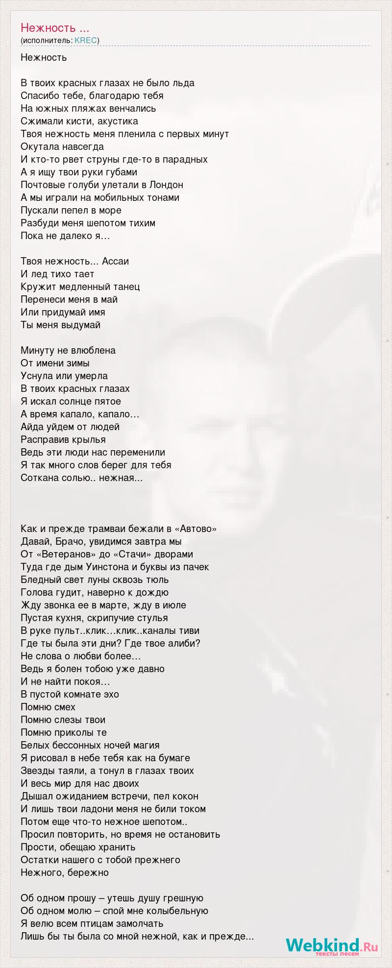 Нежность В твоих красных глазах не было льда Спасибо тебе, благодарю тебя На южных пляжах венчались Сжимали кисти, акустика Твоя нежность меня пленила с первых минут Окутала навсегда И кто-то рвет струны где-то в парадных А я ищу твои руки губами Почтовые голуби улетали в Лондон А мы играли на мобильных тонами Пускали пепел в море Разбуди меня шепотом тихим Пока не далеко я… Твоя нежность... Ассаи И лед тихо тает Кружит медленный танец Перенеси меня в май Или придумай имя Ты меня выдумай Минуту не влюблена От имени зимы Уснула или умерла В твоих красных глазах Я искал солнце пятое А время капало, капало… Айда уйдем от людей Расправив крылья Ведь эти люди нас переменили Я так много слов берег для тебя Соткана солью.. нежная... Как и прежде трамваи бежали в «Автово» Давай, Брачо, увидимся завтра мы От «Ветеранов» до «Стачи» дворами Туда где дым Уинстона и буквы из пачек Бледный свет луны сквозь тюль Голова гудит, наверно к дождю Жду звонка ее в марте, жду в июле Пустая кухня, скрипучие стулья В руке пульт..клик…клик..каналы тиви Где ты была эти дни? Где твое алиби? Не слова о любви более… Ведь я болен тобою уже давно И не найти покоя… В пустой комнате эхо Помню смех Помню слезы твои Помню приколы те Белых бессонных ночей магия Я рисовал в небе тебя как на бумаге Звезды таяли, а тонул в глазах твоих И весь мир для нас двоих Дышал ожиданием встречи, пел кокон И лишь твои ладони меня не били током Потом еще что-то нежное шепотом.. Просил повторить, но время не остановить Прости, обещаю хранить Остатки нашего с тобой прежнего Нежного, бережно Об одном прошу – утешь душу грешную Об одном молю – спой мне колыбельную Я велю всем птицам замолчать Лишь бы ты была со мной нежной, как и прежде...