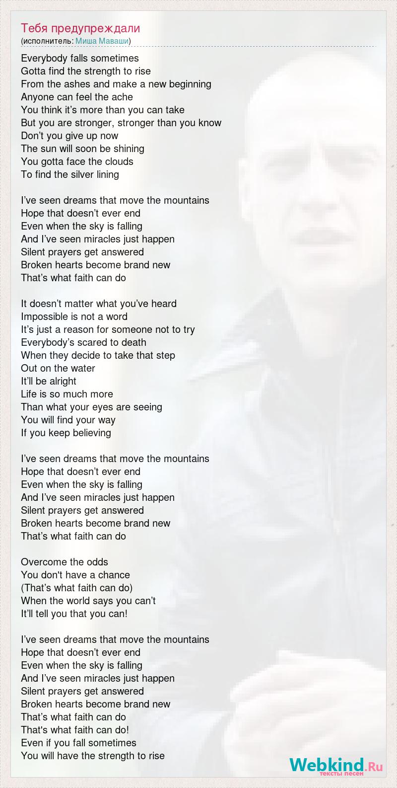 Everybody falls sometimes Gotta find the strength to rise From the ashes and make a new beginning Anyone can feel the ache You think it’s more than you can take But you are stronger, stronger than you know Don’t you give up now The sun will soon be shining You gotta face the clouds To find the silver lining I’ve seen dreams that move the mountains Hope that doesn’t ever end Even when the sky is falling And I’ve seen miracles just happen Silent prayers get answered Broken hearts become brand new That’s what faith can do It doesn’t matter what you’ve heard Impossible is not a word It’s just a reason for someone not to try Everybody’s scared to death When they decide to take that step Out on the water It’ll be alright Life is so much more Than what your eyes are seeing You will find your way If you keep believing I’ve seen dreams that move the mountains Hope that doesn’t ever end Even when the sky is falling And I’ve seen miracles just happen Silent prayers get answered Broken hearts become brand new That’s what faith can do Overcome the odds You don't have a chance (That’s what faith can do) When the world says you can’t It’ll tell you that you can! I’ve seen dreams that move the mountains Hope that doesn’t ever end Even when the sky is falling And I’ve seen miracles just happen Silent prayers get answered Broken hearts become brand new That’s what faith can do That's what faith can do! Even if you fall sometimes You will have the strength to rise