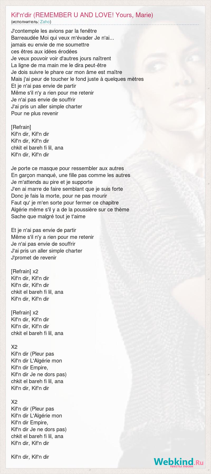 J'contemple les avions par la fenêtre Barreaudée Moi qui veux m'évader Je n'ai... jamais eu envie de me soumettre ces êtres aux idées érodées Je veux pouvoir voir d'autres jours naîtrent La ligne de ma main me le dira peut-être Je dois suivre le phare car mon âme est maître Mais j'ai peur de toucher le fond juste à quelques mètres Et je n'ai pas envie de partir Même s'il n'y a rien pour me retenir Je n'ai pas envie de souffrir J'ai pris un aller simple charter Pour ne plus revenir [Refrain] Kif'n dir, Kif'n dir Kif'n dir, Kif'n dir chkit el bareh fi lil, ana Kif'n dir, Kif'n dir Je porte ce masque pour ressembler aux autres En garçon manqué, une fille pas comme les autres Je m'attends au pire et je supporte J'en ai marre de faire semblant que je suis forte Donc je fais la morte, pour ne pas mourir Faut qu' je m'en sorte pour fermer ce chapitre Algérie même s'il y a de la poussière sur ce thème Sache que malgré tout je t'aime Et je n'ai pas envie de partir Même s'il n'y a rien pour me retenir Je n'ai pas envie de souffrir J'ai pris un aller simple charter J'promet de revenir [Refrain] x2 Kif'n dir, Kif'n dir Kif'n dir, Kif'n dir chkit el bareh fi lil, ana Kif'n dir, Kif'n dir [Refrain] x2 Kif'n dir, Kif'n dir Kif'n dir, Kif'n dir chkit el bareh fi lil, ana X2 Kif'n dir (Pleur pas Kif'n dir L'Algérie mon Kif'n dir Empire, Kif'n dir Je ne dors pas) chkit el bareh fi lil, ana Kif'n dir, Kif'n dir X2 Kif'n dir (Pleur pas Kif'n dir L'Algérie mon Kif'n dir Empire, Kif'n dir Je ne dors pas) chkit el bareh fi lil, ana Kif'n dir, Kif'n dir Kif'n dir, Kif'n dir
