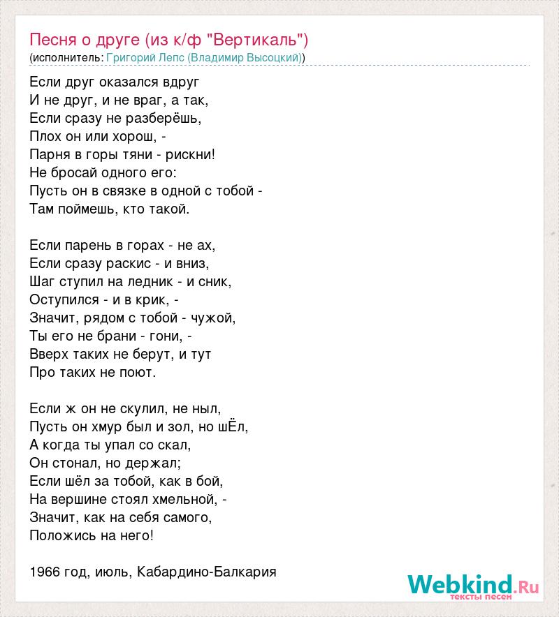 Если друг оказался вдруг И не друг, и не враг, а так, Если сразу не разберёшь, Плох он или хорош, - Парня в горы тяни - рискни! Не бросай одного его: Пусть он в связке в одной с тобой - Там поймешь, кто такой. Если парень в горах - не ах, Если сразу раскис - и вниз, Шаг ступил на ледник - и сник, Оступился - и в крик, - Значит, рядом с тобой - чужой, Ты его не брани - гони, - Вверх таких не берут, и тут Про таких не поют. Если ж он не скулил, не ныл, Пусть он хмур был и зол, но шЁл, А когда ты упал со скал, Он стонал, но держал; Если шёл за тобой, как в бой, На вершине стоял хмельной, - Значит, как на себя самого, Положись на него! 1966 год, июль, Кабардино-Балкария