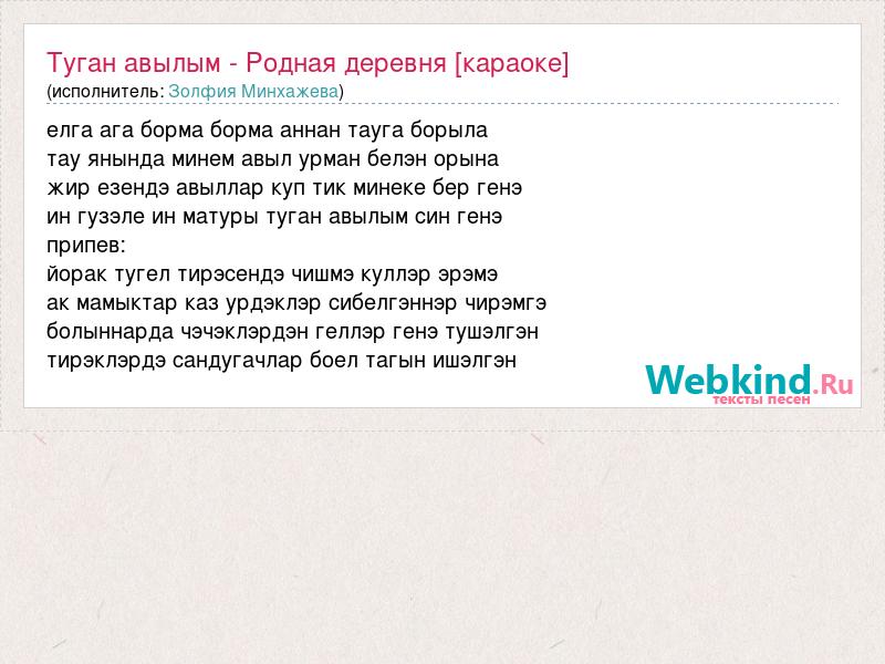 елга ага борма борма аннан тауга борыла тау янында минем авыл урман белэн орына жир езендэ авыллар куп тик минеке бер генэ ин гузэле ин матуры туган авылым син генэ припев: йорак тугел тирэсендэ чишмэ куллэр эрэмэ ак мамыктар каз урдэклэр сибелгэннэр чирэмгэ болыннарда чэчэклэрдэн геллэр генэ тушэлгэн тирэклэрдэ сандугачлар боел тагын ишэлгэн