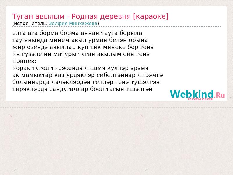 елга ага борма борма аннан тауга борыла тау янында минем авыл урман белэн орына жир езендэ авыллар куп тик минеке бер генэ ин гузэле ин матуры туган авылым син генэ припев: йорак тугел тирэсендэ чишмэ куллэр эрэмэ ак мамыктар каз урдэклэр сибелгэннэр чирэмгэ болыннарда чэчэклэрдэн геллэр генэ тушэлгэн тирэклэрдэ сандугачлар боел тагын ишэлгэн