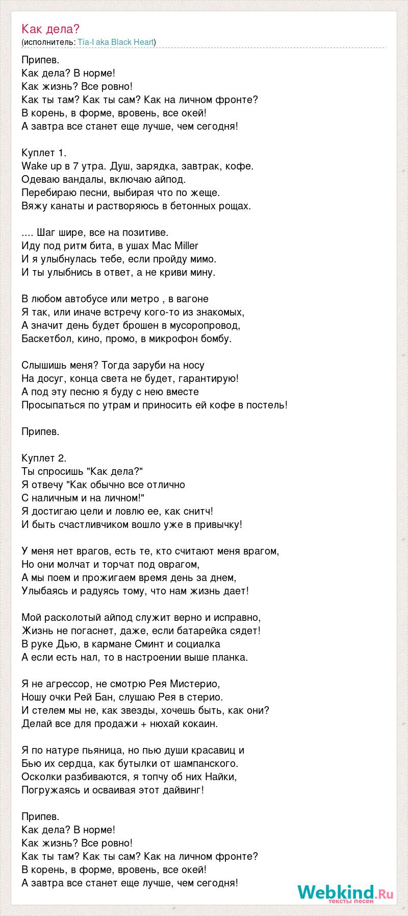 Припев. Как дела? В норме! Как жизнь? Все ровно! Как ты там? Как ты сам? Как на личном фронте? В корень, в форме, вровень, все окей! А завтра все станет еще лучше, чем сегодня! Куплет 1. Wake up в 7 утра. Душ, зарядка, завтрак, кофе. Одеваю вандалы, включаю айпод. Перебираю песни, выбирая что по жеще. Вяжу канаты и растворяюсь в бетонных рощах. .... Шаг шире, все на позитиве. Иду под ритм бита, в ушах Mac Miller И я улыбнулась тебе, если пройду мимо. И ты улыбнись в ответ, а не криви мину. В любом автобусе или метро , в вагоне Я так, или иначе встречу кого-то из знакомых, А значит день будет брошен в мусоропровод, Баскетбол, кино, промо, в микрофон бомбу. Слышишь меня? Тогда заруби на носу На досуг, конца света не будет, гарантирую! А под эту песню я буду с нею вместе Просыпаться по утрам и приносить ей кофе в постель! Припев. Куплет 2. Ты спросишь "Как дела?" Я отвечу "Как обычно все отлично С наличным и на личном!" Я достигаю цели и ловлю ее, как снитч! И быть счастливчиком вошло уже в привычку! У меня нет врагов, есть те, кто считают меня врагом, Но они молчат и торчат под оврагом, А мы поем и прожигаем время день за днем, Улыбаясь и радуясь тому, что нам жизнь дает! Мой расколотый айпод служит верно и исправно, Жизнь не погаснет, даже, если батарейка сядет! В руке Дью, в кармане Сминт и социалка А если есть нал, то в настроении выше планка. Я не агрессор, не смотрю Рея Мистерио, Ношу очки Рей Бан, слушаю Рея в стерио. И стелем мы не, как звезды, хочешь быть, как они? Делай все для продажи + нюхай кокаин. Я по натуре пьяница, но пью души красавиц и Бью их сердца, как бутылки от шампанского. Осколки разбиваются, я топчу об них Найки, Погружаясь и осваивая этот дайвинг! Припев. Как дела? В норме! Как жизнь? Все ровно! Как ты там? Как ты сам? Как на личном фронте? В корень, в форме, вровень, все окей! А завтра все станет еще лучше, чем сегодня!