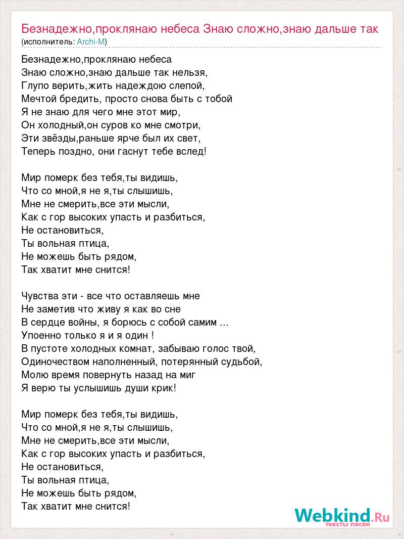 Главная→Исполнители→Archi-M→Безнадежно,проклянаю небеса Знаю сложно,знаю дальше так нельзя, Глупо верить,жит