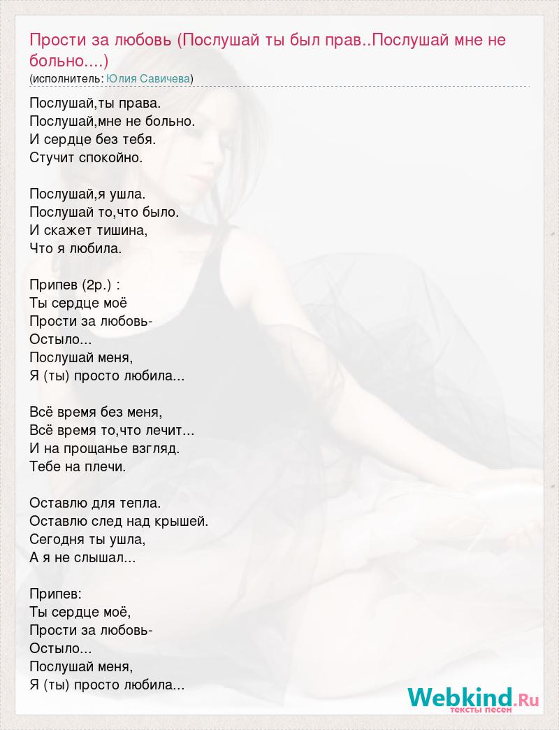 Послушай,ты права. Послушай,мне не больно. И сердце без тебя. Стучит спокойно. Послушай,я ушла. Послушай то,что было. И скажет тишина, Что я любила. Припев (2р.) : Ты сердце моё Прости за любовь- Остыло... Послушай меня, Я (ты) просто любила... Всё время без меня, Всё время то,что лечит... И на прощанье взгляд. Тебе на плечи. Оставлю для тепла. Оставлю след над крышей. Сегодня ты ушла, А я не слышал... Припев: Ты сердце моё, Прости за любовь- Остыло... Послушай меня, Я (ты) просто любила...