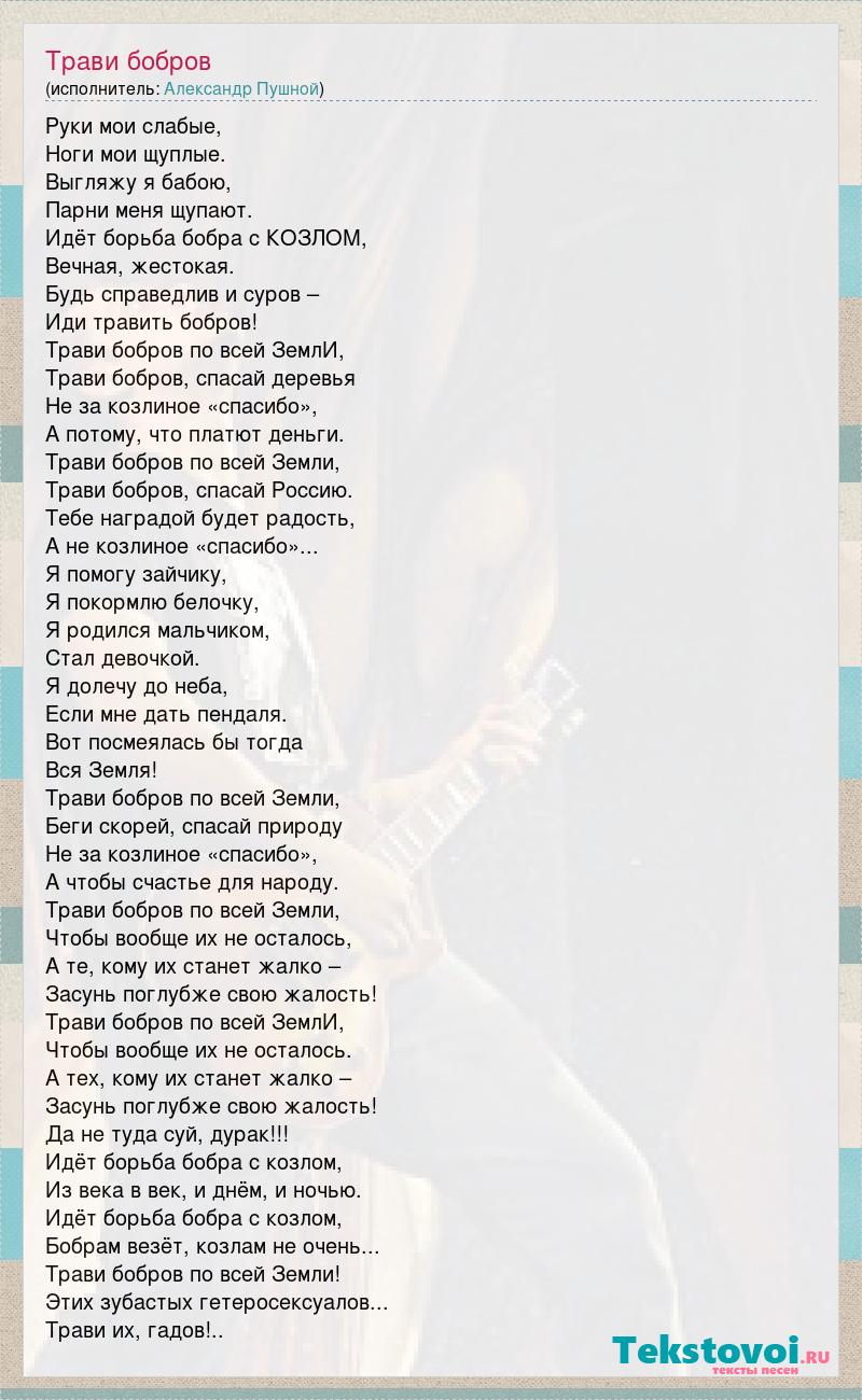 Руки мои слабые, Ноги мои щуплые. Выгляжу я бабою, Парни меня щупают. Идёт борьба бобра с КОЗЛОМ, Вечная, жестокая. Будь справедлив и суров – Иди травить бобров! Трави бобров по всей ЗемлИ, Трави бобров, спасай деревья Не за козлиное «спасибо», А потому, что платют деньги. Трави бобров по всей Земли, Трави бобров, спасай Россию. Тебе наградой будет радость, А не козлиное «спасибо»... Я помогу зайчику, Я покормлю белочку, Я родился мальчиком, Стал девочкой. Я долечу до неба, Если мне дать пендаля. Вот посмеялась бы тогда Вся Земля! Трави бобров по всей Земли, Беги скорей, спасай природу Не за козлиное «спасибо», А чтобы счастье для народу. Трави бобров по всей Земли, Чтобы вообще их не осталось, А те, кому их станет жалко – Засунь поглубже свою жалость! Трави бобров по всей ЗемлИ, Чтобы вообще их не осталось. А тех, кому их станет жалко – Засунь поглубже свою жалость! Да не туда суй, дурак!!! Идёт борьба бобра с козлом, Из века в век, и днём, и ночью. Идёт борьба бобра с козлом, Бобрам везёт, козлам не очень... Трави бобров по всей Земли! Этих зубастых гетеросексуалов... Трави их, гадов!..