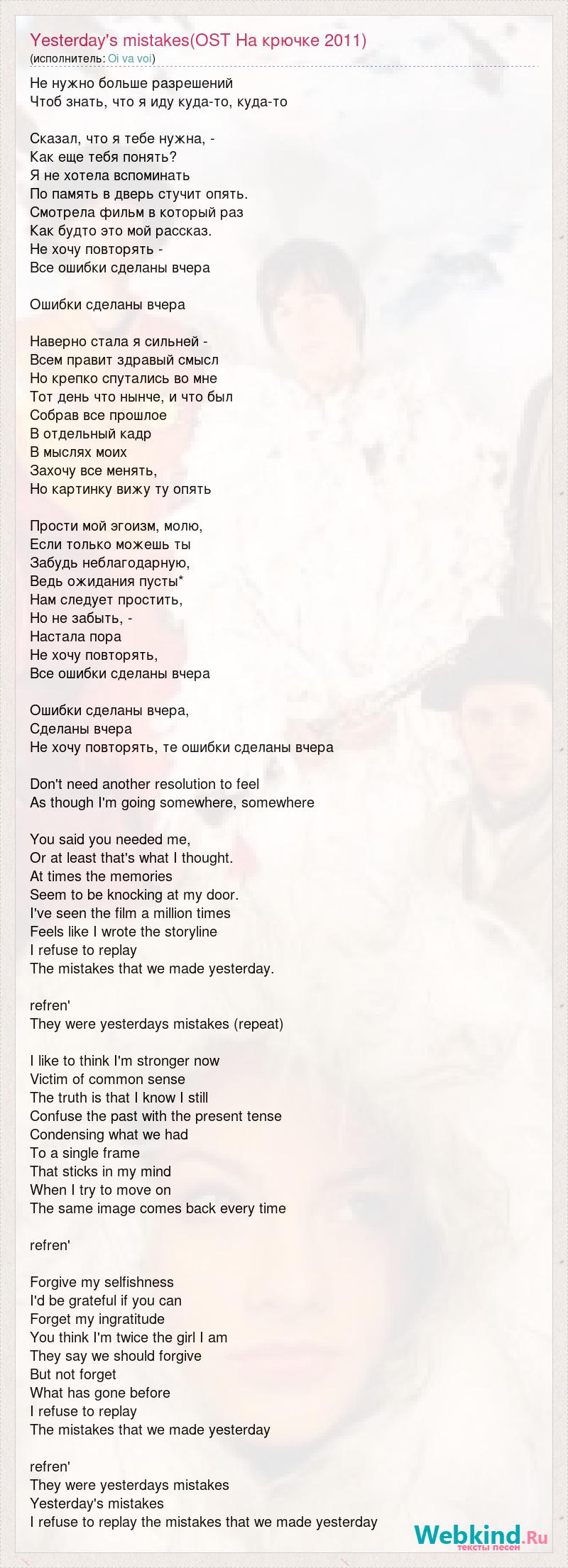Не нужно больше разрешений Чтоб знать, что я иду куда-то, куда-то Сказал, что я тебе нужна, - Как еще тебя понять? Я не хотела вспоминать По память в дверь стучит опять. Смотрела фильм в который раз Как будто это мой рассказ. Не хочу повторять - Все ошибки сделаны вчера Ошибки сделаны вчера Наверно стала я сильней - Всем правит здравый смысл Но крепко спутались во мне Тот день что нынче, и что был Собрав все прошлое В отдельный кадр В мыслях моих Захочу все менять, Но картинку вижу ту опять Прости мой эгоизм, молю, Если только можешь ты Забудь неблагодарную, Ведь ожидания пусты* Нам следует простить, Но не забыть, - Настала пора Не хочу повторять, Все ошибки сделаны вчера Ошибки сделаны вчера, Сделаны вчера Не хочу повторять, те ошибки сделаны вчера Don't need another resolution to feel As though I'm going somewhere, somewhere You said you needed me, Or at least that's what I thought. At times the memories Seem to be knocking at my door. I've seen the film a million times Feels like I wrote the storyline I refuse to replay The mistakes that we made yesterday. refren' They were yesterdays mistakes (repeat) I like to think I'm stronger now Victim of common sense The truth is that I know I still Confuse the past with the present tense Condensing what we had To a single frame That sticks in my mind When I try to move on The same image comes back every time refren' Forgive my selfishness I'd be grateful if you can Forget my ingratitude You think I'm twice the girl I am They say we should forgive But not forget What has gone before I refuse to replay The mistakes that we made yesterday refren' They were yesterdays mistakes Yesterday's mistakes I refuse to replay the mistakes that we made yesterday