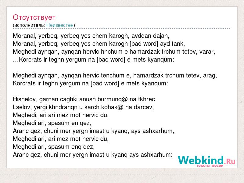 Moranal, yerbeq, yerbeq yes chem karogh, aydqan dajan, Moranal, yerbeq, yerbeq yes chem karogh [bad word] ayd tank, Meghedi aynqan, aynqan hervic hnchum e hamardzak trchum tetev, varar, …Korcrats ir teghn yergum na [bad word] e mets kyanqum: Meghedi aynqan, aynqan hervic tenchum e, hamardzak trchum tetev, arag, Korcrats ir teghn yergum na [bad word] e mets kyanqum: Hishelov, garnan caghki anush burmunq@ na tkhrec, Lselov, yergi khndranqn u karch kohak@ na darcav, Meghedi, ari ari mez mot hervic du, Meghedi ari, spasum en qez, Aranc qez, chuni mer yergn imast u kyanq, ays ashxarhum, Meghedi ari, ari mez mot hervic du, Meghedi ari, spasum enq qez, Aranc qez, chuni mer yergn imast u kyanq ays ashxarhum: