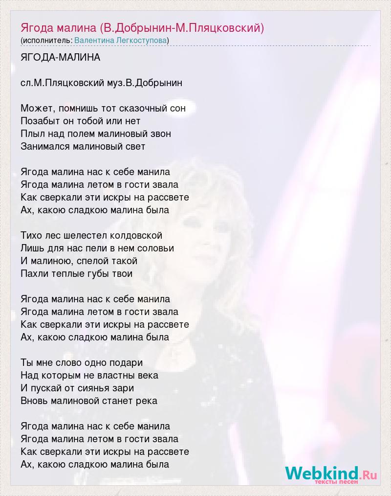 ЯГОДА-МАЛИНА сл.М.Пляцковский муз.В.Добрынин Может, помнишь тот сказочный сон Позабыт он тобой или нет Плыл над полем малиновый звон Занимался малиновый свет Ягода малина нас к себе манила Ягода малина летом в гости звала Как сверкали эти искры на рассвете Ах, какою сладкою малина была Тихо лес шелестел колдовской Лишь для нас пели в нем соловьи И малиною, спелой такой Пахли теплые губы твои Ягода малина нас к себе манила Ягода малина летом в гости звала Как сверкали эти искры на рассвете Ах, какою сладкою малина была Ты мне слово одно подари Над которым не властны века И пускай от сиянья зари Вновь малиновой станет река Ягода малина нас к себе манила Ягода малина летом в гости звала Как сверкали эти искры на рассвете Ах, какою сладкою малина была