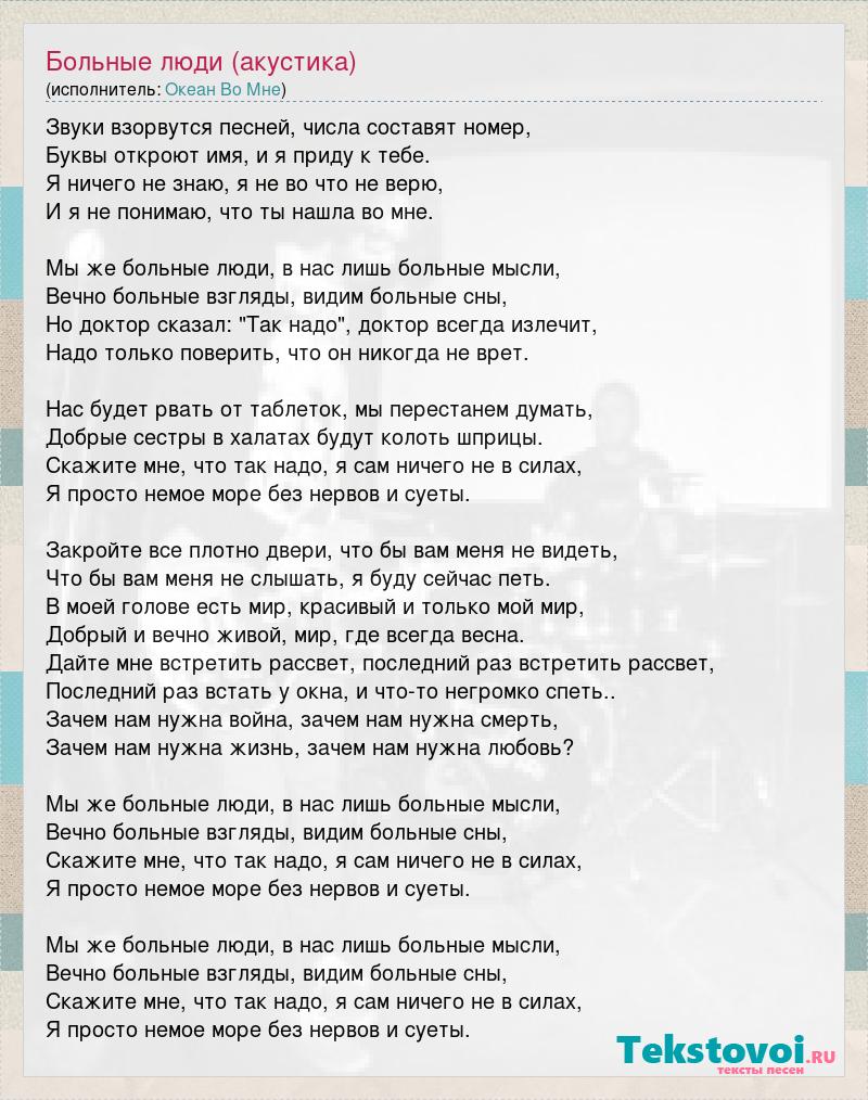 Звуки взорвутся песней, числа составят номер, Буквы откроют имя, и я приду к тебе. Я ничего не знаю, я не во что не верю, И я не понимаю, что ты нашла во мне. Мы же больные люди, в нас лишь больные мысли, Вечно больные взгляды, видим больные сны, Но доктор сказал: "Так надо", доктор всегда излечит, Надо только поверить, что он никогда не врет. Нас будет рвать от таблеток, мы перестанем думать, Добрые сестры в халатах будут колоть шприцы. Скажите мне, что так надо, я сам ничего не в силах, Я просто немое море без нервов и суеты. Закройте все плотно двери, что бы вам меня не видеть, Что бы вам меня не слышать, я буду сейчас петь. В моей голове есть мир, красивый и только мой мир, Добрый и вечно живой, мир, где всегда весна. Дайте мне встретить рассвет, последний раз встретить рассвет, Последний раз встать у окна, и что-то негромко спеть.. Зачем нам нужна война, зачем нам нужна смерть, Зачем нам нужна жизнь, зачем нам нужна любовь? Мы же больные люди, в нас лишь больные мысли, Вечно больные взгляды, видим больные сны, Скажите мне, что так надо, я сам ничего не в силах, Я просто немое море без нервов и суеты. Мы же больные люди, в нас лишь больные мысли, Вечно больные взгляды, видим больные сны, Скажите мне, что так надо, я сам ничего не в силах, Я просто немое море без нервов и суеты.