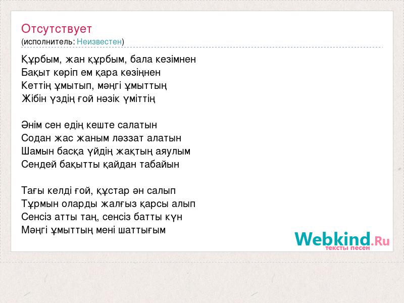 Құрбым, жан құрбым, бала кезімнен Бақыт көріп ем қара көзіңнен Кеттің ұмытып, мәңгі ұмыттың Жібін үздің ғой нәзік үміттің Әнім сен едің кеште салатын Содан жас жаным ләззат алатын Шамын басқа үйдің жақтың аяулым Сендей бақытты қайдан табайын Тағы келді ғой, құстар ән салып Тұрмын оларды жалғыз қарсы алып Сенсіз атты таң, сенсіз батты күн Мәңгі ұмыттың мені шаттығым