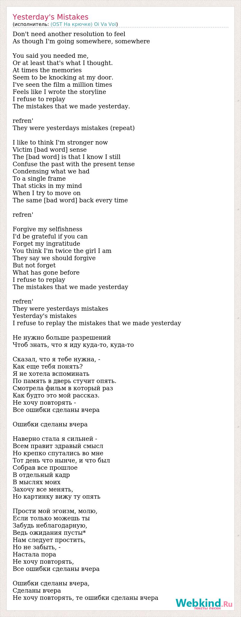 Don't need another resolution to feel As though I'm going somewhere, somewhere You said you needed me, Or at least that's what I thought. At times the memories Seem to be knocking at my door. I've seen the film a million times Feels like I wrote the storyline I refuse to replay The mistakes that we made yesterday. refren' They were yesterdays mistakes (repeat) I like to think I'm stronger now Victim [bad word] sense The [bad word] is that I know I still Confuse the past with the present tense Condensing what we had To a single frame That sticks in my mind When I try to move on The same [bad word] back every time refren' Forgive my selfishness I'd be grateful if you can Forget my ingratitude You think I'm twice the girl I am They say we should forgive But not forget What has gone before I refuse to replay The mistakes that we made yesterday refren' They were yesterdays mistakes Yesterday's mistakes I refuse to replay the mistakes that we made yesterday Не нужно больше разрешений Чтоб знать, что я иду куда-то, куда-то Сказал, что я тебе нужна, - Как еще тебя понять? Я не хотела вспоминать По память в дверь стучит опять. Смотрела фильм в который раз Как будто это мой рассказ. Не хочу повторять - Все ошибки сделаны вчера Ошибки сделаны вчера Наверно стала я сильней - Всем правит здравый смысл Но крепко спутались во мне Тот день что нынче, и что был Собрав все прошлое В отдельный кадр В мыслях моих Захочу все менять, Но картинку вижу ту опять Прости мой эгоизм, молю, Если только можешь ты Забудь неблагодарную, Ведь ожидания пусты* Нам следует простить, Но не забыть, - Настала пора Не хочу повторять, Все ошибки сделаны вчера Ошибки сделаны вчера, Сделаны вчера Не хочу повторять, те ошибки сделаны вчера