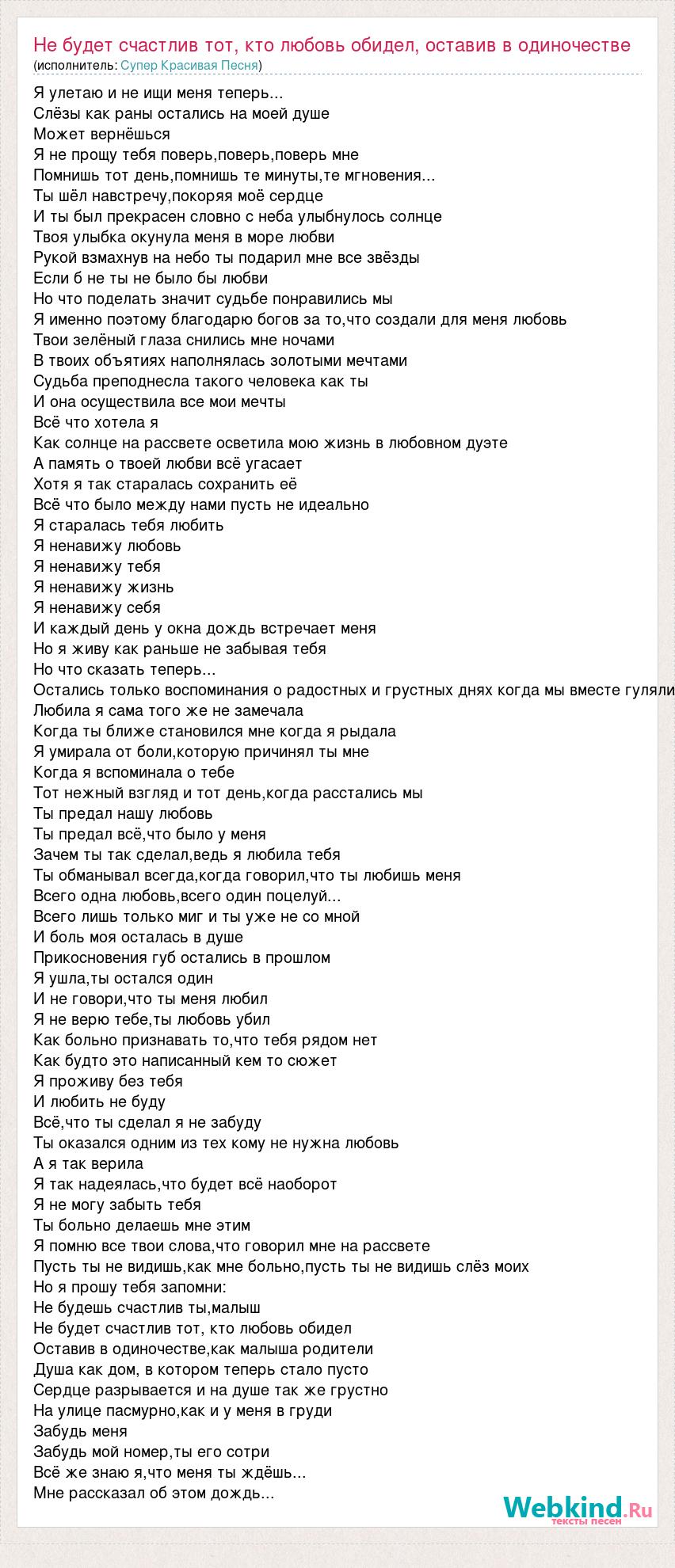Главная→Исполнители→Супер Красивая Песня→Не будет счастлив тот, кто любовь обидел, оставив в одиночестве как малыша