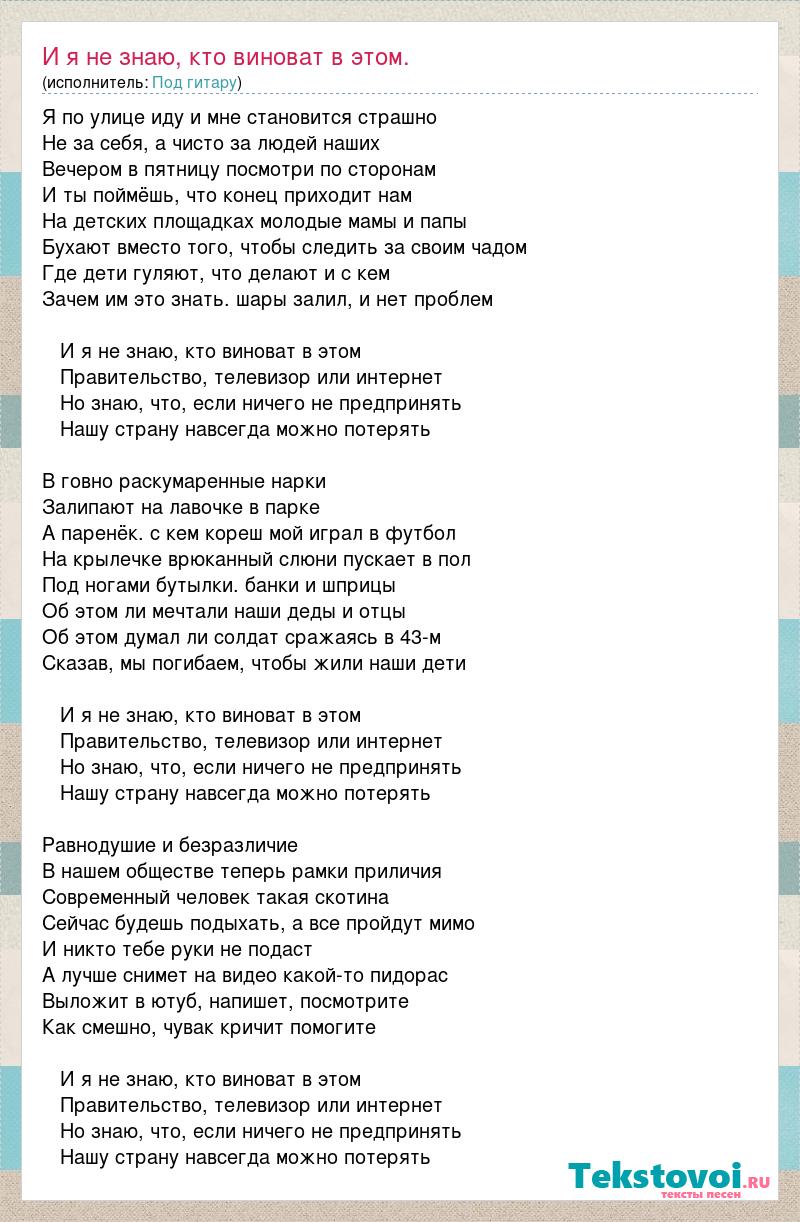 Я по улице иду и мне становится страшно Не за себя, а чисто за людей наших Вечером в пятницу посмотри по сторонам И ты поймёшь, что конец приходит нам На детских площадках молодые мамы и папы Бухают вместо того, чтобы следить за своим чадом Где дети гуляют, что делают и с кем Зачем им это знать. шары залил, и нет проблем И я не знаю, кто виноват в этом Правительство, телевизор или интернет Но знаю, что, если ничего не предпринять Нашу страну навсегда можно потерять В говно раскумаренные нарки Залипают на лавочке в парке А паренёк. с кем кореш мой играл в футбол На крылечке врюканный слюни пускает в пол Под ногами бутылки. банки и шприцы Об этом ли мечтали наши деды и отцы Об этом думал ли солдат сражаясь в 43-м Сказав, мы погибаем, чтобы жили наши дети И я не знаю, кто виноват в этом Правительство, телевизор или интернет Но знаю, что, если ничего не предпринять Нашу страну навсегда можно потерять Равнодушие и безразличие В нашем обществе теперь рамки приличия Современный человек такая скотина Сейчас будешь подыхать, а все пройдут мимо И никто тебе руки не подаст А лучше снимет на видео какой-то пидорас Выложит в ютуб, напишет, посмотрите Как смешно, чувак кричит помогите И я не знаю, кто виноват в этом Правительство, телевизор или интернет Но знаю, что, если ничего не предпринять Нашу страну навсегда можно потерять