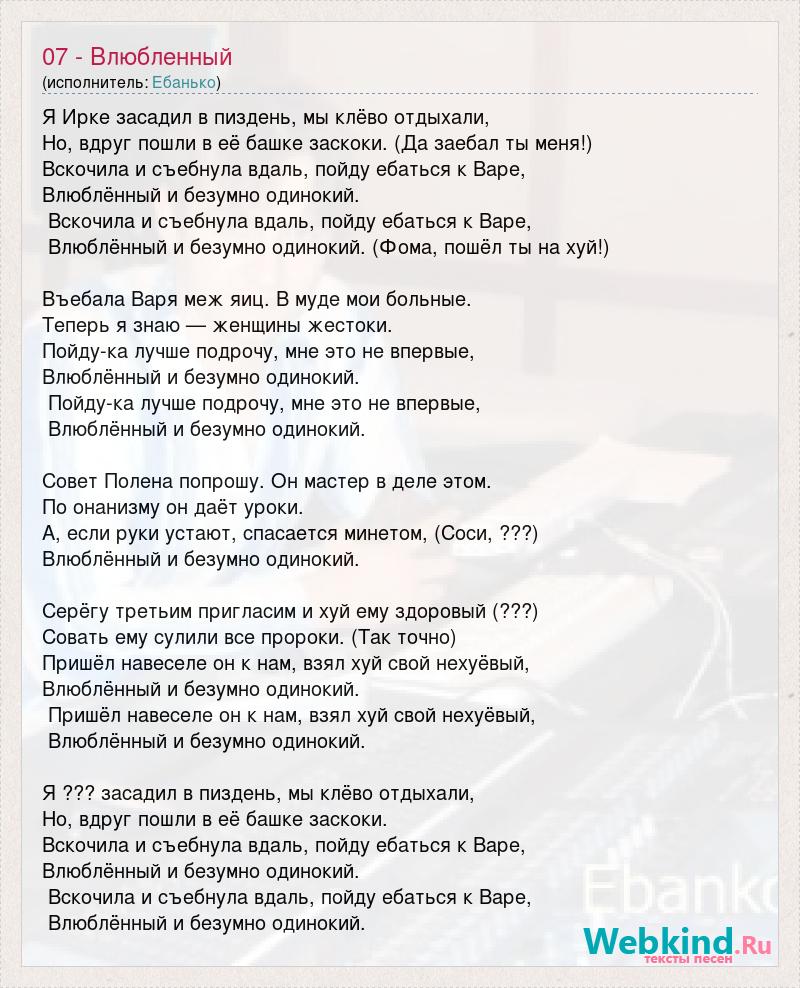 Я Ирке засадил в пиздень, мы клёво отдыхали, Но, вдруг пошли в её башке заскоки. (Да заебал ты меня!) Вскочила и съебнула вдаль, пойду ебаться к Варе, Влюблённый и безумно одинокий. Вскочила и съебнула вдаль, пойду ебаться к Варе, Влюблённый и безумно одинокий. (Фома, пошёл ты на хуй!) Въебала Варя меж яиц. В муде мои больные. Теперь я знаю — женщины жестоки. Пойду-ка лучше подрочу, мне это не впервые, Влюблённый и безумно одинокий. Пойду-ка лучше подрочу, мне это не впервые, Влюблённый и безумно одинокий. Совет Полена попрошу. Он мастер в деле этом. По онанизму он даёт уроки. А, если руки устают, спасается минетом, (Соси, ???) Влюблённый и безумно одинокий. Серёгу третьим пригласим и хуй ему здоровый (???) Совать ему сулили все пророки. (Так точно) Пришёл навеселе он к нам, взял хуй свой нехуёвый, Влюблённый и безумно одинокий. Пришёл навеселе он к нам, взял хуй свой нехуёвый, Влюблённый и безумно одинокий. Я ??? засадил в пиздень, мы клёво отдыхали, Но, вдруг пошли в её башке заскоки. Вскочила и съебнула вдаль, пойду ебаться к Варе, Влюблённый и безумно одинокий. Вскочила и съебнула вдаль, пойду ебаться к Варе, Влюблённый и безумно одинокий.