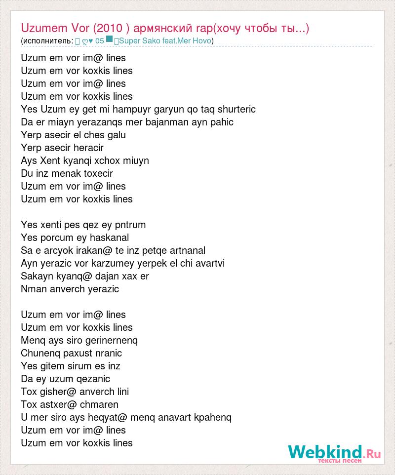А как ты думаешь, о чем песня "Uzumem Vor (2010 ) армянский rap(хочу чтобы ты...)" ?