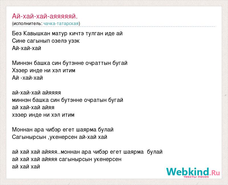 Без Кавышкан матур кичтэ тулган иде ай Сине сагынып озелэ узэк Ай-хай-хай Миннэн башка син бутэнне очраттын бугай Хэзер инде ни хэл итим Ай -хай-хай ай-хай-хай айяяяя миннэн башка син бутэнне очратын бугай ай хай-хай айяя хэзер инде ни хэл итим Моннан ара чибэр егет шаярма булай Сагынырсын ,укенерсен ай-хай хай ай хай хай айяяя..моннан ара чибэр егет шаярма булай ай хай хай айяяя сагынырсын укенерсен ай хай хай