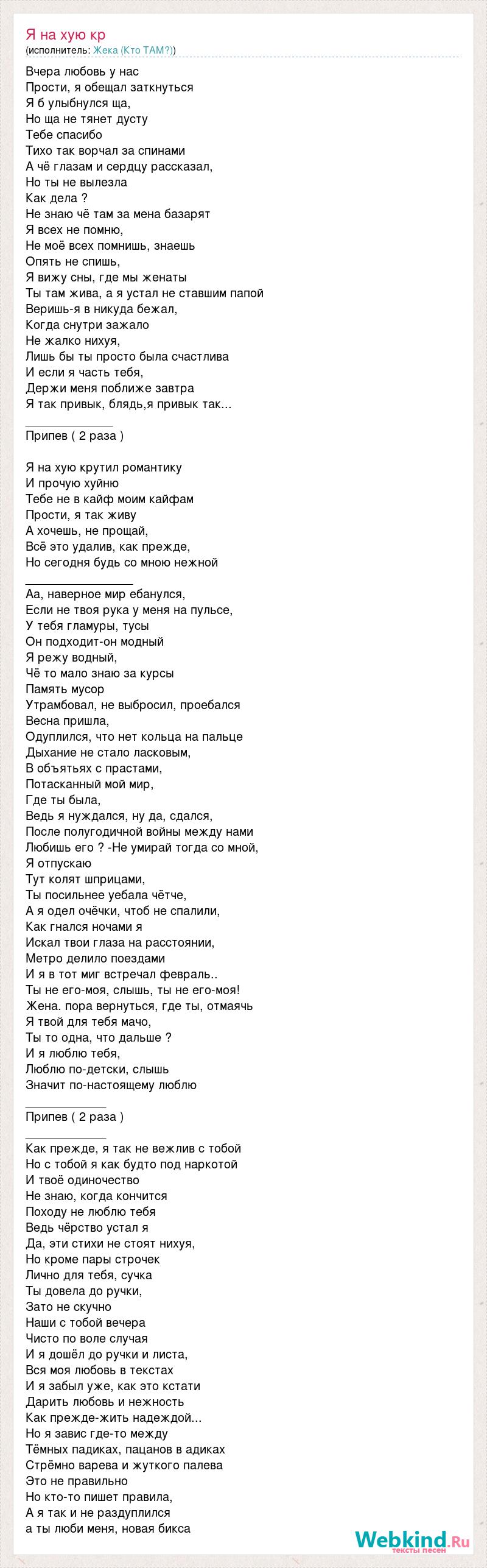 Вчера любовь у нас Прости, я обещал заткнуться Я б улыбнулся ща, Но ща не тянет дусту Тебе спасибо Тихо так ворчал за спинами А чё глазам и сердцу рассказал, Но ты не вылезла Как дела ? Не знаю чё там за мена базарят Я всех не помню, Не моё всех помнишь, знаешь Опять не спишь, Я вижу сны, где мы женаты Ты там жива, а я устал не ставшим папой Веришь-я в никуда бежал, Когда снутри зажало Не жалко нихуя, Лишь бы ты просто была счастлива И если я часть тебя, Держи меня поближе завтра Я так привык, блядь,я привык так... _____________ Припев ( 2 раза ) Я на хую крутил романтику И прочую хуйню Тебе не в кайф моим кайфам Прости, я так живу А хочешь, не прощай, Всё это удалив, как прежде, Но сегодня будь со мною нежной ________________ Аа, наверное мир ебанулся, Если не твоя рука у меня на пульсе, У тебя гламуры, тусы Он подходит-он модный Я режу водный, Чё то мало знаю за курсы Память мусор Утрамбовал, не выбросил, проебался Весна пришла, Одуплился, что нет кольца на пальце Дыхание не стало ласковым, В объятьях с прастами, Потасканный мой мир, Где ты была, Ведь я нуждался, ну да, сдался, После полугодичной войны между нами Любишь его ? -Не умирай тогда со мной, Я отпускаю Тут колят шприцами, Ты посильнее уебала чётче, А я одел очёчки, чтоб не спалили, Как гнался ночами я Искал твои глаза на расстоянии, Метро делило поездами И я в тот миг встречал февраль.. Ты не его-моя, слышь, ты не его-моя! Жена. пора вернуться, где ты, отмаячь Я твой для тебя мачо, Ты то одна, что дальше ? И я люблю тебя, Люблю по-детски, слышь Значит по-настоящему люблю ____________ Припев ( 2 раза ) ____________ Как прежде, я так не вежлив с тобой Но с тобой я как будто под наркотой И твоё одиночество Не знаю, когда кончится Походу не люблю тебя Ведь чёрство устал я Да, эти стихи не стоят нихуя, Но кроме пары строчек Лично для тебя, сучка Ты довела до ручки, Зато не скучно Наши с тобой вечера Чисто по воле случая И я дошёл до ручки и листа, Вся моя любовь в текстах И я забыл уже, как это кстати Дарить любовь и нежность Как прежде-жить надеждой... Но я завис где-то между Тёмных падиках, пацанов в адиках Стрёмно варева и жуткого палева Это не правильно Но кто-то пишет правила, А я так и не раздуплился а ты люби меня, новая бикса