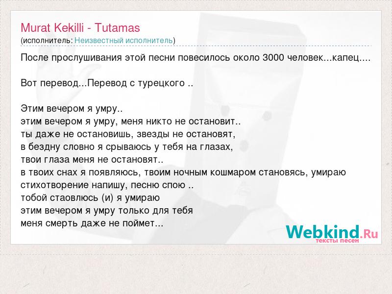 После прослушивания этой песни повесилось около 3000 человек...капец.... Вот перевод...Перевод с турецкого .. Этим вечером я умру.. этим вечером я умру, меня никто не остановит.. ты даже не остановишь, звезды не остановят, в бездну словно я срываюсь у тебя на глазах, твои глаза меня не остановят.. в твоих снах я появляюсь, твоим ночным кошмаром становясь, умираю стихотворение напишу, песню спою .. тобой стаовлюсь (и) я умираю этим вечером я умру только для тебя меня смерть даже не поймет...