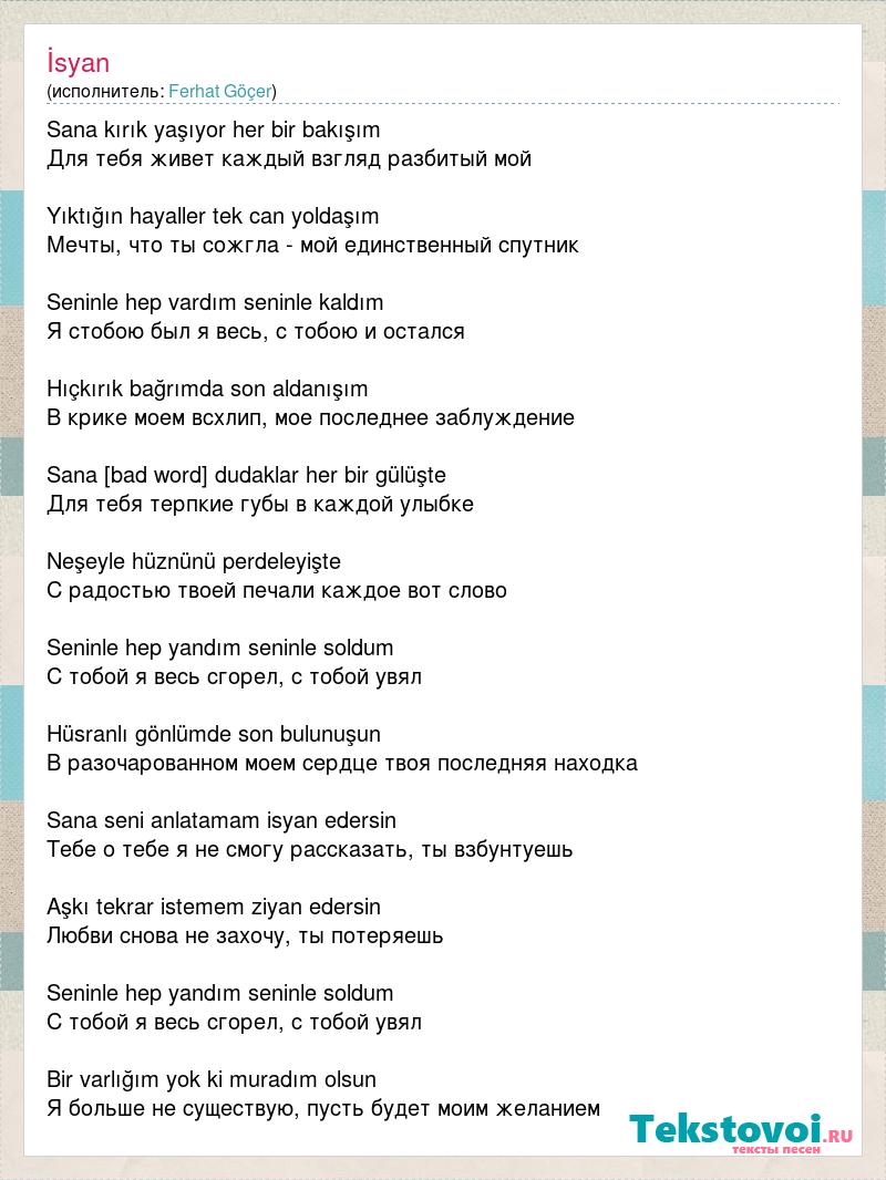 Sana kırık yaşıyor her bir bakışım Для тебя живет каждый взгляд разбитый мой Yıktığın hayaller tek can yoldaşım Мечты, что ты сожгла - мой единственный спутник Seninle hep vardım seninle kaldım Я стобою был я весь, с тобою и остался Hıçkırık bağrımda son aldanışım В крике моем всхлип, мое последнее заблуждение Sana buruk dudaklar her bir gülüşte Для тебя терпкие губы в каждой улыбке Neşeyle hüznünü perdeleyişte С радостью твоей печали каждое вот слово Seninle hep yandım seninle soldum С тобой я весь сгорел, с тобой увял Hüsranlı gönlümde son bulunuşun В разочарованном моем сердце твоя последняя находка Sana seni anlatamam isyan edersin Тебе о тебе я не смогу рассказать, ты взбунтуешь Aşkı tekrar istemem ziyan edersin Любви снова не захочу, ты потеряешь Seninle hep yandım seninle soldum С тобой я весь сгорел, с тобой увял Bir varlığım yok ki muradım olsun Я больше не существую, пусть будет моим желанием
