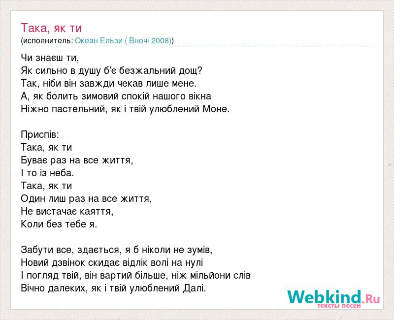 Чи знаєш ти, Як сильно в душу б’є безжальний дощ? Так, ніби він завжди чекав лише мене. А, як болить зимовий спокій нашого вікна Ніжно пастельний, як і твій улюблений Моне. Приспів: Така, як ти Буває раз на все життя, І то із неба. Така, як ти Один лиш раз на все життя, Не вистачає каяття, Коли без тебе я. Забути все, здається, я б ніколи не зумів, Новий дзвінок скидає відлік волі на нулі І погляд твій, він вартий більше, ніж мільйони слів Вічно далеких, як і твій улюблений Далі.