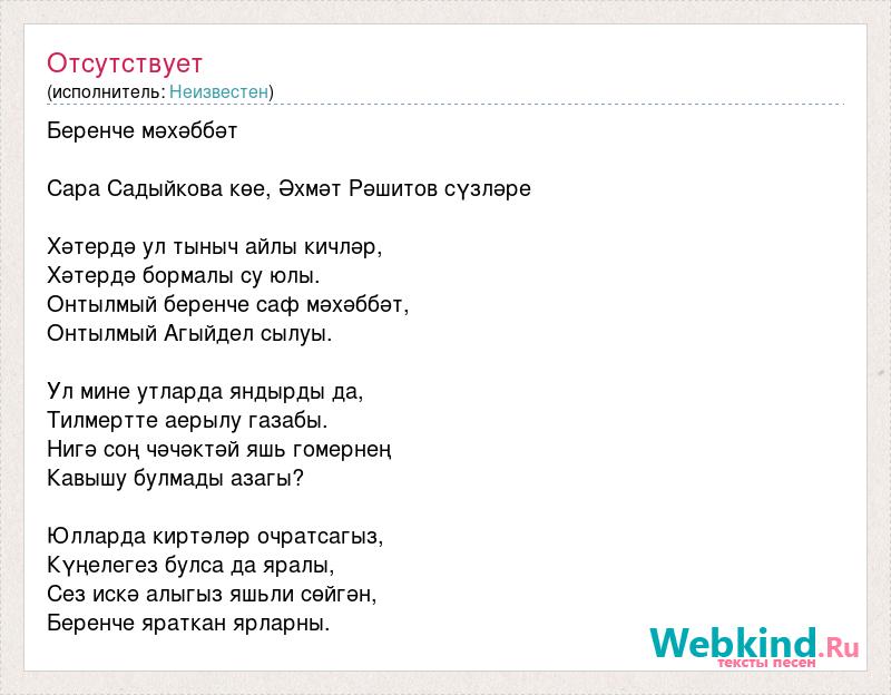 Беренче мәхәббәт Сара Садыйкова көе, Әхмәт Рәшитов сүзләре Хәтердә ул тыныч айлы кичләр, Хәтердә бормалы су юлы. Онтылмый беренче саф мәхәббәт, Онтылмый Агыйдел сылуы. Ул мине утларда яндырды да, Тилмертте аерылу газабы. Нигә соң чәчәктәй яшь гомернең Кавышу булмады азагы? Юлларда киртәләр очратсагыз, Күңелегез булса да яралы, Сез искә алыгыз яшьли сөйгән, Беренче яраткан ярларны.