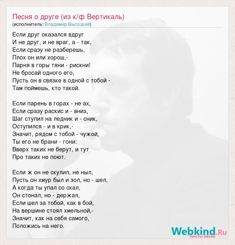 Если друг оказался вдруг И не друг, и не враг, а - так, Если сразу не разберешь, Плох он или хорош,- Парня в горы тяни - рискни! Не бросай одного его, Пусть он в связке в одной с тобой - Там поймешь, кто такой. Если парень в горах - не ах, Если сразу раскис и - вниз, Шаг ступил на ледник и - сник, Оступился - и в крик,- Значит, рядом с тобой - чужой, Ты его не брани - гони: Вверх таких не берут, и тут Про таких не поют. Если ж он не скулил, не ныл, Пусть он хмур был и зол, но - шел, А когда ты упал со скал, Он стонал, но - держал, Если шел за тобой, как в бой, На вершине стоял хмельной,- Значит, как на себя самого, Положись на него.