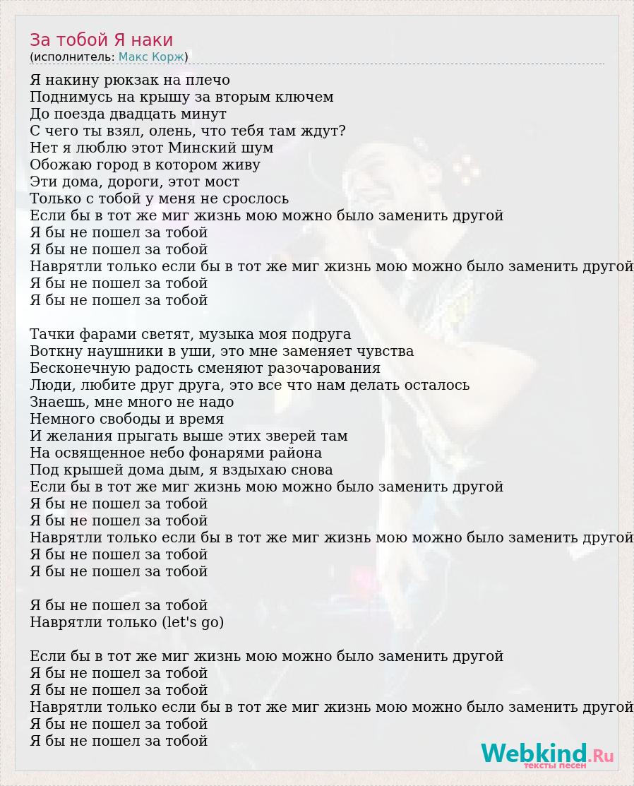 Я накину рюкзак на плечо Поднимусь на крышу за вторым ключем До поезда двадцать минут С чего ты взял, олень, что тебя там ждут? Нет я люблю этот Минский шум Обожаю город в котором живу Эти дома, дороги, этот мост Только с тобой у меня не срослось Если бы в тот же миг жизнь мою можно было заменить другой Я бы не пошел за тобой Я бы не пошел за тобой Наврятли только если бы в тот же миг жизнь мою можно было заменить другой Я бы не пошел за тобой Я бы не пошел за тобой Тачки фарами светят, музыка моя подруга Воткну наушники в уши, это мне заменяет чувства Бесконечную радость сменяют разочарования Люди, любите друг друга, это все что нам делать осталось Знаешь, мне много не надо Немного свободы и время И желания прыгать выше этих зверей там На освященное небо фонарями района Под крышей дома дым, я вздыхаю снова Если бы в тот же миг жизнь мою можно было заменить другой Я бы не пошел за тобой Я бы не пошел за тобой Наврятли только если бы в тот же миг жизнь мою можно было заменить другой Я бы не пошел за тобой Я бы не пошел за тобой Я бы не пошел за тобой Наврятли только (let's go) Если бы в тот же миг жизнь мою можно было заменить другой Я бы не пошел за тобой Я бы не пошел за тобой Наврятли только если бы в тот же миг жизнь мою можно было заменить другой Я бы не пошел за тобой Я бы не пошел за тобой