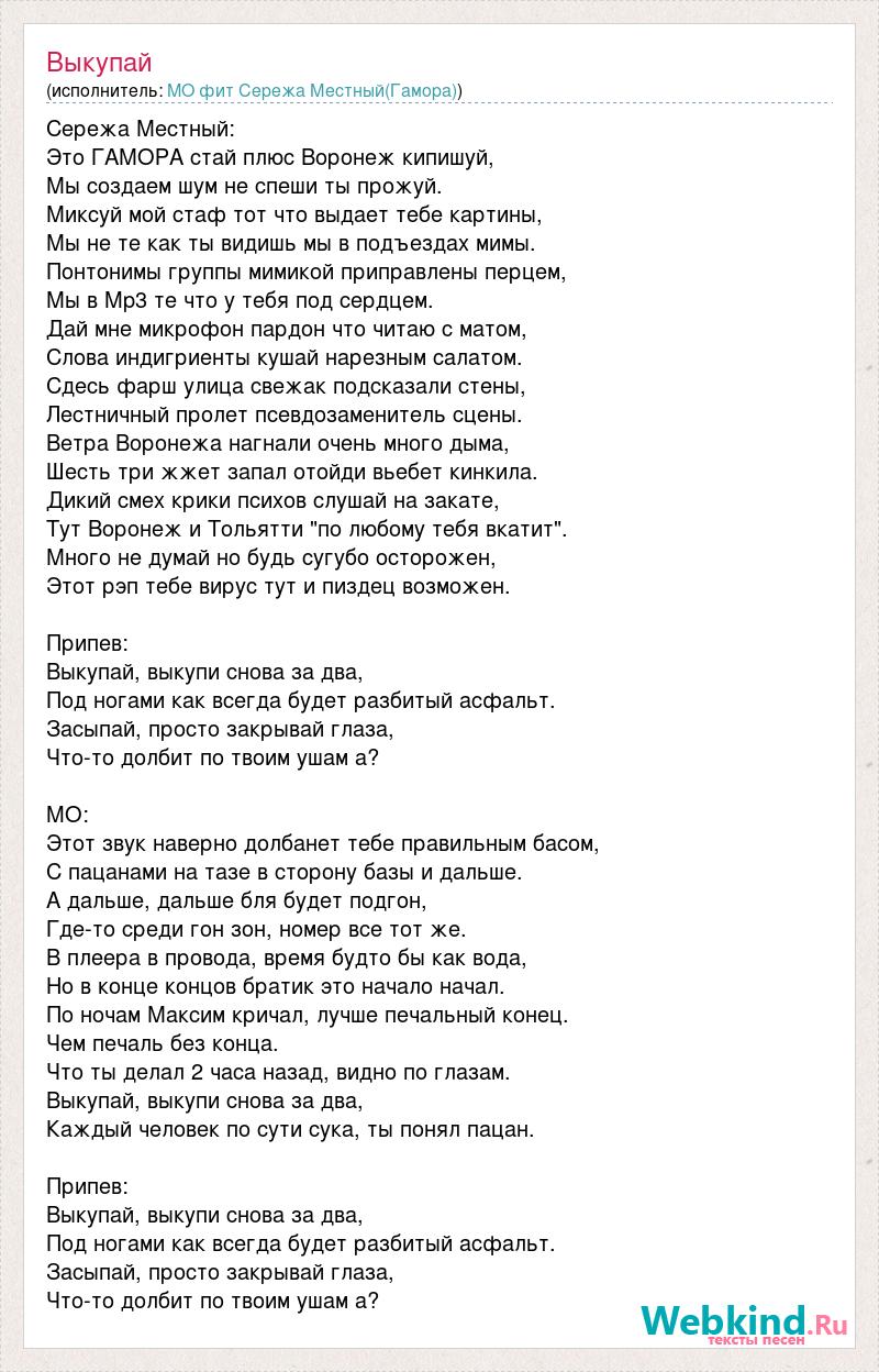 Сережа Местный: Это ГАМОРА стай плюс Воронеж кипишуй, Мы создаем шум не спеши ты прожуй. Миксуй мой стаф тот что выдает тебе картины, Мы не те как ты видишь мы в подъездах мимы. Понтонимы группы мимикой приправлены перцем, Мы в Mp3 те что у тебя под сердцем. Дай мне микрофон пардон что читаю с матом, Слова индигриенты кушай нарезным салатом. Сдесь фарш улица свежак подсказали стены, Лестничный пролет псевдозаменитель сцены. Ветра Воронежа нагнали очень много дыма, Шесть три жжет запал отойди вьебет кинкила. Дикий смех крики психов слушай на закате, Тут Воронеж и Тольятти "по любому тебя вкатит". Много не думай но будь сугубо осторожен, Этот рэп тебе вирус тут и пиздец возможен. Припев: Выкупай, выкупи снова за два, Под ногами как всегда будет разбитый асфальт. Засыпай, просто закрывай глаза, Что-то долбит по твоим ушам а? MO: Этот звук наверно долбанет тебе правильным басом, С пацанами на тазе в сторону базы и дальше. А дальше, дальше бля будет подгон, Где-то среди гон зон, номер все тот же. В плеера в провода, время будто бы как вода, Но в конце концов братик это начало начал. По ночам Максим кричал, лучше печальный конец. Чем печаль без конца. Что ты делал 2 часа назад, видно по глазам. Выкупай, выкупи снова за два, Каждый человек по сути сука, ты понял пацан. Припев: Выкупай, выкупи снова за два, Под ногами как всегда будет разбитый асфальт. Засыпай, просто закрывай глаза, Что-то долбит по твоим ушам а?