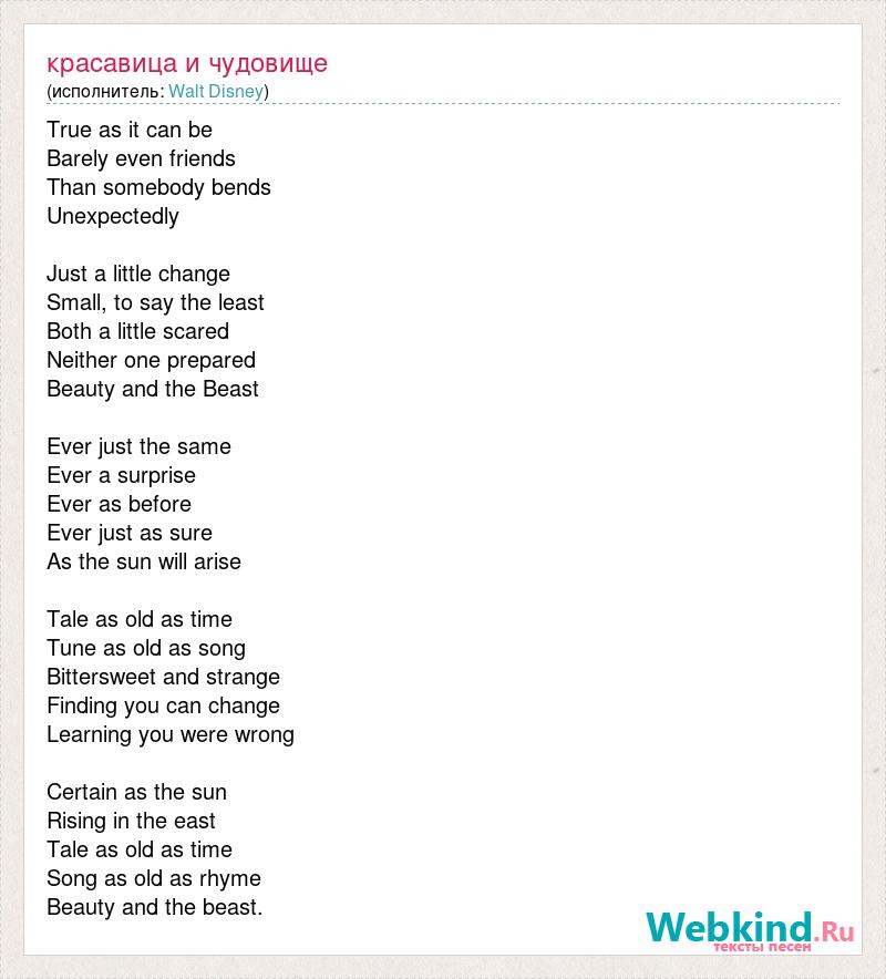 True as it can be Barely even friends Than somebody bends Unexpectedly Just a little change Small, to say the least Both a little scared Neither one prepared Beauty and the Beast Ever just the same Ever a surprise Ever as before Ever just as sure As the sun will arise Tale as old as time Tune as old as song Bittersweet and strange Finding you can change Learning you were wrong Certain as the sun Rising in the east Tale as old as time Song as old as rhyme Beauty and the beast.