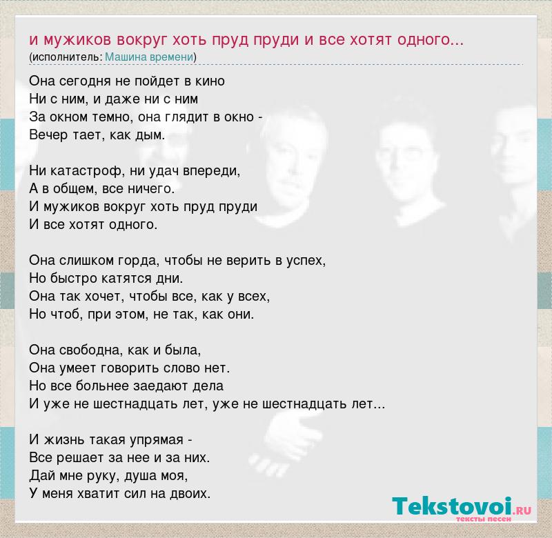 Она сегодня не пойдет в кино Ни с ним, и даже ни с ним За окном темно, она глядит в окно - Вечер тает, как дым. Ни катастроф, ни удач впереди, А в общем, все ничего. И мужиков вокруг хоть пруд пруди И все хотят одного. Она слишком горда, чтобы не верить в успех, Но быстро катятся дни. Она так хочет, чтобы все, как у всех, Но чтоб, при этом, не так, как они. Она свободна, как и была, Она умеет говорить слово нет. Но все больнее заедают дела И уже не шестнадцать лет, уже не шестнадцать лет... И жизнь такая упрямая - Все решает за нее и за них. Дай мне руку, душа моя, У меня хватит сил на двоих.