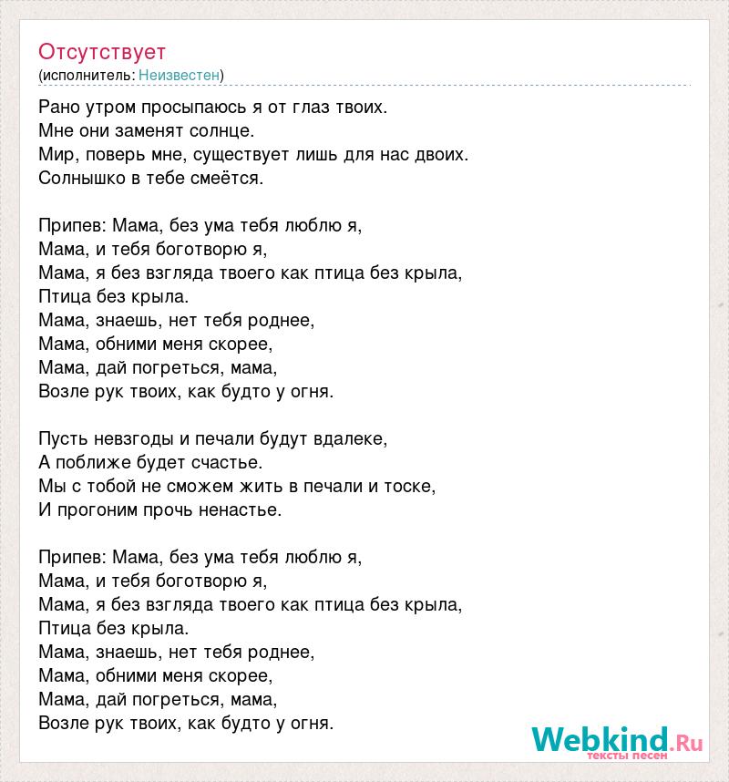 Рано утром просыпаюсь я от глаз твоих. Мне они заменят солнце. Мир, поверь мне, существует лишь для нас двоих. Солнышко в тебе смеётся. Припев: Мама, без ума тебя люблю я, Мама, и тебя боготворю я, Мама, я без взгляда твоего как птица без крыла, Птица без крыла. Мама, знаешь, нет тебя роднее, Мама, обними меня скорее, Мама, дай погреться, мама, Возле рук твоих, как будто у огня. Пусть невзгоды и печали будут вдалеке, А поближе будет счастье. Мы с тобой не сможем жить в печали и тоске, И прогоним прочь ненастье. Припев: Мама, без ума тебя люблю я, Мама, и тебя боготворю я, Мама, я без взгляда твоего как птица без крыла, Птица без крыла. Мама, знаешь, нет тебя роднее, Мама, обними меня скорее, Мама, дай погреться, мама, Возле рук твоих, как будто у огня.