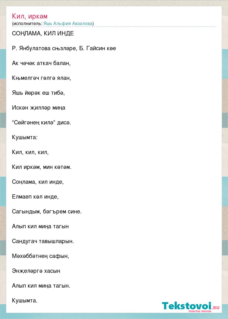 СОҢЛАМА, КИЛ ИНДЕ Р. Янбулатова сњзләре, Б. Гайсин көе Ак чәчәк аткач балан, Књмелгәч гөлгә ялан, Яшь йөрәк еш тибә, Искән җилләр миңа “Сөйгәнең килә” дисә. Кушымта: Кил, кил, кил, Кил иркәм, мин көтәм. Соңлама, кил инде, Елмаеп көл инде, Сагындым, бәгърем сине. Алып кил миңа тагын Сандугач тавышларын. Мәхәббәтнең сафын, Энҗеләргә хасын Алып кил миңа тагын. Кушымта.