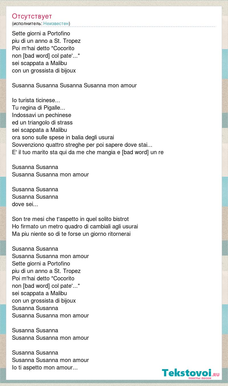 Sette giorni a Portofino piu di un anno a St. Tropez Poi m'hai detto "Cocorito non mi compri col pate'..." sei scappata a Malibu con un grossista di bijoux Susanna Susanna Susanna Susanna mon amour Io turista ticinese... Tu regina di Pigalle... Indossavi un pechinese ed un triangolo di strass sei scappata a Malibu ora sono sulle spese in balia degli usurai Sovvenziono quattro streghe per poi sapere dove stai... E' il tuo marito sta qui da me che mangia e dorme come un re Susanna Susanna Susanna Susanna mon amour Susanna Susanna Susanna Susanna dove sei... Son tre mesi che t'aspetto in quel solito bistrot Ho firmato un metro quadro di cambiali agli usurai Ma piu niente so di te forse un giorno ritornerai Susanna Susanna Susanna Susanna mon amour Sette giorni a Portofino piu di un anno a St. Tropez Poi m'hai detto "Cocorito non mi compri col pate'..." sei scappata a Malibu con un grossista di bijoux Susanna Susanna Susanna Susanna mon amour Susanna Susanna Susanna Susanna mon amour Susanna Susanna Susanna Susanna mon amour Io ti aspetto mon amour...