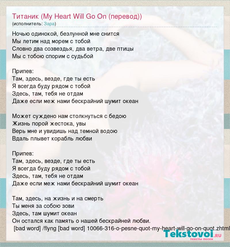 Ночью одинокой, безлунной мне снится Мы летим над морем с тобой Словно два созвездья, два ветра, две птицы Мы с тобою спорим с судьбой Припев: Там, здесь, везде, где ты есть Я всегда буду рядом с тобой Здесь, там, тебя не отдам Даже если меж нами бескрайний шумит океан Может суждено нам столкнуться с бедою Жизнь порой жестока, увы Верь мне и увидишь над темной водою Вдаль плывет корабль любви Припев: Там, здесь, везде, где ты есть Я всегда буду рядом с тобой Здесь, там, тебя не отдам Даже если меж нами бескрайний шумит океан Там, здесь, на жизнь и на смерть Ты меня за собою зови Здесь, там шумит океан Он остался как память о нашей бескрайней любви. [bad word] /flyng [bad word] 10066-316-o-pesne-quot-my-heart-will-go-on-quot.zhtml