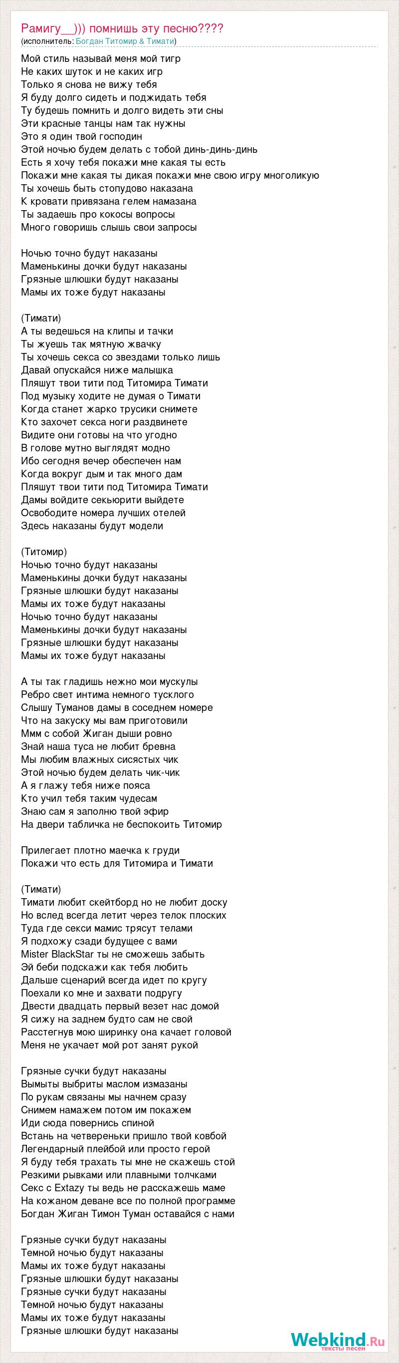 Мой стиль называй меня мой тигр Не каких шуток и не каких игр Только я снова не вижу тебя Я буду долго сидеть и поджидать тебя Ту будешь помнить и долго видеть эти сны Эти красные танцы нам так нужны Это я один твой господин Этой ночью будем делать с тобой динь-динь-динь Есть я хочу тебя покажи мне какая ты есть Покажи мне какая ты дикая покажи мне свою игру многоликую Ты хочешь быть стопудово наказана К кровати привязана гелем намазана Ты задаешь про кокосы вопросы Много говоришь слышь свои запросы Ночью точно будут наказаны Маменькины дочки будут наказаны Грязные шлюшки будут наказаны Мамы их тоже будут наказаны (Тимати) А ты ведешься на клипы и тачки Ты жуешь так мятную жвачку Ты хочешь секса со звездами только лишь Давай опускайся ниже малышка Пляшут твои тити под Титомира Тимати Под музыку ходите не думая о Тимати Когда станет жарко трусики снимете Кто захочет секса ноги раздвинете Видите они готовы на что угодно В голове мутно выглядят модно Ибо сегодня вечер обеспечен нам Когда вокруг дым и так много дам Пляшут твои тити под Титомира Тимати Дамы войдите секьюрити выйдете Освободите номера лучших отелей Здесь наказаны будут модели (Титомир) Ночью точно будут наказаны Маменькины дочки будут наказаны Грязные шлюшки будут наказаны Мамы их тоже будут наказаны Ночью точно будут наказаны Маменькины дочки будут наказаны Грязные шлюшки будут наказаны Мамы их тоже будут наказаны А ты так гладишь нежно мои мускулы Ребро свет интима немного тусклого Слышу Туманов дамы в соседнем номере Что на закуску мы вам приготовили Ммм с собой Жиган дыши ровно Знай наша туса не любит бревна Мы любим влажных сисястых чик Этой ночью будем делать чик-чик А я глажу тебя ниже пояса Кто учил тебя таким чудесам Знаю сам я заполню твой эфир На двери табличка не беспокоить Титомир Прилегает плотно маечка к груди Покажи что есть для Титомира и Тимати (Тимати) Тимати любит скейтборд но не любит доску Но вслед всегда летит через телок плоских Туда где секси мамис трясут телами Я подхожу сзади будущее с вами Mister BlackStar ты не сможешь забыть Эй беби подскажи как тебя любить Дальше сценарий всегда идет по кругу Поехали ко мне и захвати подругу Двести двадцать первый везет нас домой Я сижу на заднем будто сам не свой Расстегнув мою ширинку она качает головой Меня не укачает мой рот занят рукой Грязные сучки будут наказаны Вымыты выбриты маслом измазаны По рукам связаны мы начнем сразу Снимем намажем потом им покажем Иди сюда повернись спиной Встань на четвереньки пришло твой ковбой Легендарный плейбой или просто герой Я буду тебя трахать ты мне не скажешь стой Резкими рывками или плавными толчками Секс с Extazy ты ведь не расскажешь маме На кожаном деване все по полной программе Богдан Жиган Тимон Туман оставайся с нами Грязные сучки будут наказаны Темной ночью будут наказаны Мамы их тоже будут наказаны Грязные шлюшки будут наказаны Грязные сучки будут наказаны Темной ночью будут наказаны Мамы их тоже будут наказаны Грязные шлюшки будут наказаны