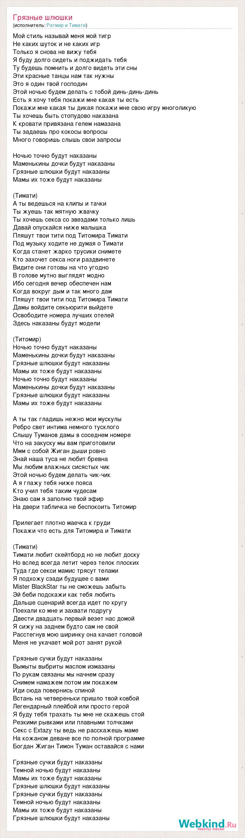 Мой стиль называй меня мой тигр Не каких шуток и не каких игр Только я снова не вижу тебя Я буду долго сидеть и поджидать тебя Ту будешь помнить и долго видеть эти сны Эти красные танцы нам так нужны Это я один твой господин Этой ночью будем делать с тобой динь-динь-динь Есть я хочу тебя покажи мне какая ты есть Покажи мне какая ты дикая покажи мне свою игру многоликую Ты хочешь быть стопудово наказана К кровати привязана гелем намазана Ты задаешь про кокосы вопросы Много говоришь слышь свои запросы Ночью точно будут наказаны Маменькины дочки будут наказаны Грязные шлюшки будут наказаны Мамы их тоже будут наказаны (Тимати) А ты ведешься на клипы и тачки Ты жуешь так мятную жвачку Ты хочешь секса со звездами только лишь Давай опускайся ниже малышка Пляшут твои тити под Титомира Тимати Под музыку ходите не думая о Тимати Когда станет жарко трусики снимете Кто захочет секса ноги раздвинете Видите они готовы на что угодно В голове мутно выглядят модно Ибо сегодня вечер обеспечен нам Когда вокруг дым и так много дам Пляшут твои тити под Титомира Тимати Дамы войдите секьюрити выйдете Освободите номера лучших отелей Здесь наказаны будут модели (Титомир) Ночью точно будут наказаны Маменькины дочки будут наказаны Грязные шлюшки будут наказаны Мамы их тоже будут наказаны Ночью точно будут наказаны Маменькины дочки будут наказаны Грязные шлюшки будут наказаны Мамы их тоже будут наказаны А ты так гладишь нежно мои мускулы Ребро свет интима немного тусклого Слышу Туманов дамы в соседнем номере Что на закуску мы вам приготовили Ммм с собой Жиган дыши ровно Знай наша туса не любит бревна Мы любим влажных сисястых чик Этой ночью будем делать чик-чик А я глажу тебя ниже пояса Кто учил тебя таким чудесам Знаю сам я заполню твой эфир На двери табличка не беспокоить Титомир Прилегает плотно маечка к груди Покажи что есть для Титомира и Тимати (Тимати) Тимати любит скейтборд но не любит доску Но вслед всегда летит через телок плоских Туда где секси мамис трясут телами Я подхожу сзади будущее с вами Mister BlackStar ты не сможешь забыть Эй беби подскажи как тебя любить Дальше сценарий всегда идет по кругу Поехали ко мне и захвати подругу Двести двадцать первый везет нас домой Я сижу на заднем будто сам не свой Расстегнув мою ширинку она качает головой Меня не укачает мой рот занят рукой Грязные сучки будут наказаны Вымыты выбриты маслом измазаны По рукам связаны мы начнем сразу Снимем намажем потом им покажем Иди сюда повернись спиной Встань на четвереньки пришло твой ковбой Легендарный плейбой или просто герой Я буду тебя трахать ты мне не скажешь стой Резкими рывками или плавными толчками Секс с Extazy ты ведь не расскажешь маме На кожаном деване все по полной программе Богдан Жиган Тимон Туман оставайся с нами Грязные сучки будут наказаны Темной ночью будут наказаны Мамы их тоже будут наказаны Грязные шлюшки будут наказаны Грязные сучки будут наказаны Темной ночью будут наказаны Мамы их тоже будут наказаны Грязные шлюшки будут наказаны