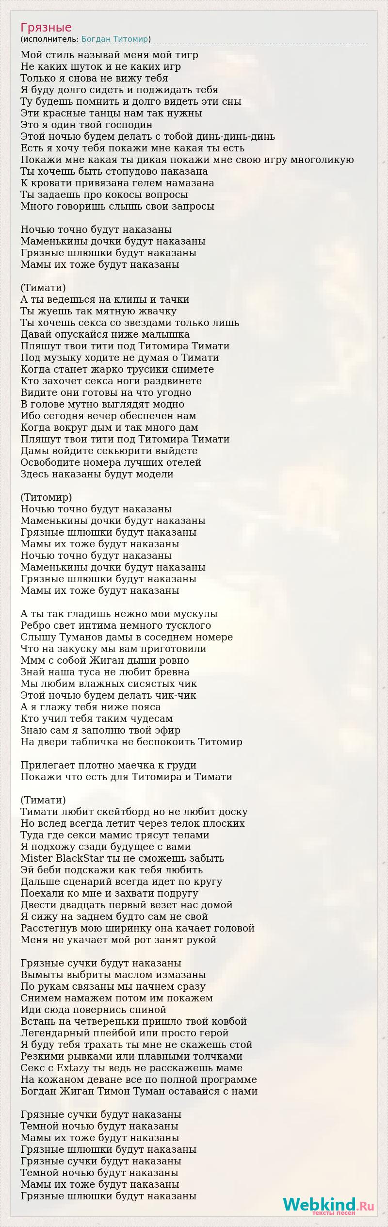 Мой стиль называй меня мой тигр Не каких шуток и не каких игр Только я снова не вижу тебя Я буду долго сидеть и поджидать тебя Ту будешь помнить и долго видеть эти сны Эти красные танцы нам так нужны Это я один твой господин Этой ночью будем делать с тобой динь-динь-динь Есть я хочу тебя покажи мне какая ты есть Покажи мне какая ты дикая покажи мне свою игру многоликую Ты хочешь быть стопудово наказана К кровати привязана гелем намазана Ты задаешь про кокосы вопросы Много говоришь слышь свои запросы Ночью точно будут наказаны Маменькины дочки будут наказаны Грязные шлюшки будут наказаны Мамы их тоже будут наказаны (Тимати) А ты ведешься на клипы и тачки Ты жуешь так мятную жвачку Ты хочешь секса со звездами только лишь Давай опускайся ниже малышка Пляшут твои тити под Титомира Тимати Под музыку ходите не думая о Тимати Когда станет жарко трусики снимете Кто захочет секса ноги раздвинете Видите они готовы на что угодно В голове мутно выглядят модно Ибо сегодня вечер обеспечен нам Когда вокруг дым и так много дам Пляшут твои тити под Титомира Тимати Дамы войдите секьюрити выйдете Освободите номера лучших отелей Здесь наказаны будут модели (Титомир) Ночью точно будут наказаны Маменькины дочки будут наказаны Грязные шлюшки будут наказаны Мамы их тоже будут наказаны Ночью точно будут наказаны Маменькины дочки будут наказаны Грязные шлюшки будут наказаны Мамы их тоже будут наказаны А ты так гладишь нежно мои мускулы Ребро свет интима немного тусклого Слышу Туманов дамы в соседнем номере Что на закуску мы вам приготовили Ммм с собой Жиган дыши ровно Знай наша туса не любит бревна Мы любим влажных сисястых чик Этой ночью будем делать чик-чик А я глажу тебя ниже пояса Кто учил тебя таким чудесам Знаю сам я заполню твой эфир На двери табличка не беспокоить Титомир Прилегает плотно маечка к груди Покажи что есть для Титомира и Тимати (Тимати) Тимати любит скейтборд но не любит доску Но вслед всегда летит через телок плоских Туда где секси мамис трясут телами Я подхожу сзади будущее с вами Mister BlackStar ты не сможешь забыть Эй беби подскажи как тебя любить Дальше сценарий всегда идет по кругу Поехали ко мне и захвати подругу Двести двадцать первый везет нас домой Я сижу на заднем будто сам не свой Расстегнув мою ширинку она качает головой Меня не укачает мой рот занят рукой Грязные сучки будут наказаны Вымыты выбриты маслом измазаны По рукам связаны мы начнем сразу Снимем намажем потом им покажем Иди сюда повернись спиной Встань на четвереньки пришло твой ковбой Легендарный плейбой или просто герой Я буду тебя трахать ты мне не скажешь стой Резкими рывками или плавными толчками Секс с Extazy ты ведь не расскажешь маме На кожаном деване все по полной программе Богдан Жиган Тимон Туман оставайся с нами Грязные сучки будут наказаны Темной ночью будут наказаны Мамы их тоже будут наказаны Грязные шлюшки будут наказаны Грязные сучки будут наказаны Темной ночью будут наказаны Мамы их тоже будут наказаны Грязные шлюшки будут наказаны