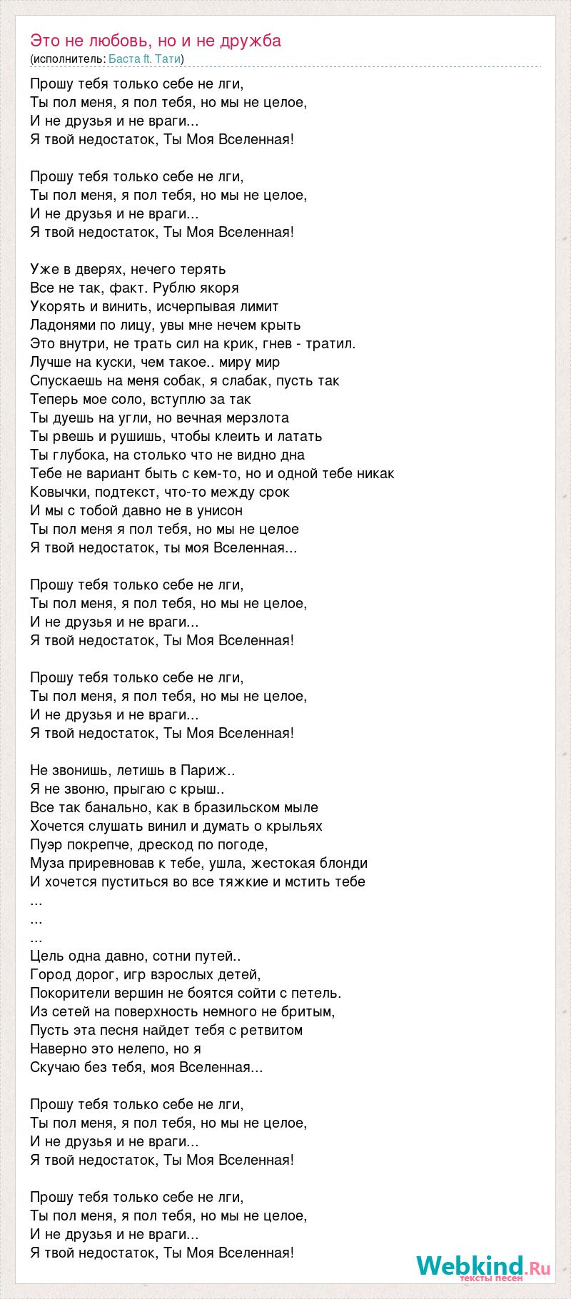Прошу тебя только себе не лги, Ты пол меня, я пол тебя, но мы не целое, И не друзья и не враги... Я твой недостаток, Ты Моя Вселенная! Прошу тебя только себе не лги, Ты пол меня, я пол тебя, но мы не целое, И не друзья и не враги... Я твой недостаток, Ты Моя Вселенная! Уже в дверях, нечего терять Все не так, факт. Рублю якоря Укорять и винить, исчерпывая лимит Ладонями по лицу, увы мне нечем крыть Это внутри, не трать сил на крик, гнев - тратил. Лучше на куски, чем такое.. миру мир Спускаешь на меня собак, я слабак, пусть так Теперь мое соло, вступлю за так Ты дуешь на угли, но вечная мерзлота Ты рвешь и рушишь, чтобы клеить и латать Ты глубока, на столько что не видно дна Тебе не вариант быть с кем-то, но и одной тебе никак Ковычки, подтекст, что-то между срок И мы с тобой давно не в унисон Ты пол меня я пол тебя, но мы не целое Я твой недостаток, ты моя Вселенная... Прошу тебя только себе не лги, Ты пол меня, я пол тебя, но мы не целое, И не друзья и не враги... Я твой недостаток, Ты Моя Вселенная! Прошу тебя только себе не лги, Ты пол меня, я пол тебя, но мы не целое, И не друзья и не враги... Я твой недостаток, Ты Моя Вселенная! Не звонишь, летишь в Париж.. Я не звоню, прыгаю с крыш.. Все так банально, как в бразильском мыле Хочется слушать винил и думать о крыльях Пуэр покрепче, дрескод по погоде, Муза приревновав к тебе, ушла, жестокая блонди И хочется пуститься во все тяжкие и мстить тебе ... ... ... Цель одна давно, сотни путей.. Город дорог, игр взрослых детей, Покорители вершин не боятся сойти с петель. Из сетей на поверхность немного не бритым, Пусть эта песня найдет тебя с ретвитом Наверно это нелепо, но я Скучаю без тебя, моя Вселенная... Прошу тебя только себе не лги, Ты пол меня, я пол тебя, но мы не целое, И не друзья и не враги... Я твой недостаток, Ты Моя Вселенная! Прошу тебя только себе не лги, Ты пол меня, я пол тебя, но мы не целое, И не друзья и не враги... Я твой недостаток, Ты Моя Вселенная!