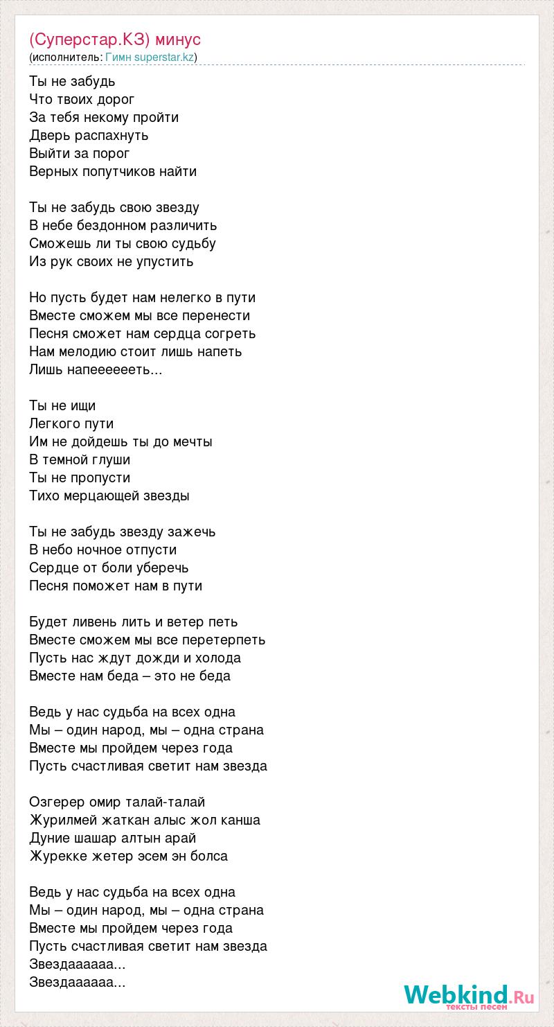Ты не забудь Что твоих дорог За тебя некому пройти Дверь распахнуть Выйти за порог Верных попутчиков найти Ты не забудь свою звезду В небе бездонном различить Сможешь ли ты свою судьбу Из рук своих не упустить Но пусть будет нам нелегко в пути Вместе сможем мы все перенести Песня сможет нам сердца согреть Нам мелодию стоит лишь напеть Лишь напееееееть... Ты не ищи Легкого пути Им не дойдешь ты до мечты В темной глуши Ты не пропусти Тихо мерцающей звезды Ты не забудь звезду зажечь В небо ночное отпусти Сердце от боли уберечь Песня поможет нам в пути Будет ливень лить и ветер петь Вместе сможем мы все перетерпеть Пусть нас ждут дожди и холода Вместе нам беда – это не беда Ведь у нас судьба на всех одна Мы – один народ, мы – одна страна Вместе мы пройдем через года Пусть счастливая светит нам звезда Озгерер омир талай-талай Журилмей жаткан алыс жол канша Дуние шашар алтын арай Журекке жетер эсем эн болса Ведь у нас судьба на всех одна Мы – один народ, мы – одна страна Вместе мы пройдем через года Пусть счастливая светит нам звезда Звездаааааа... Звездаааааа...