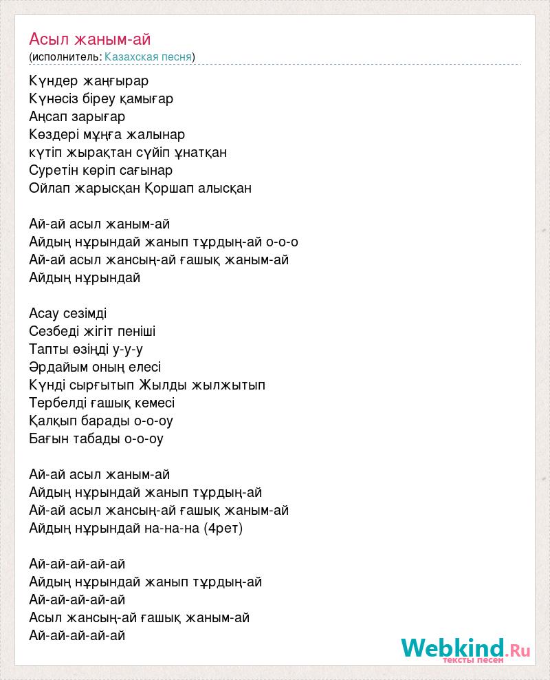 Күндер жаңғырар Күнәсіз біреу қамығар Аңсап зарығар Көздері мұңға жалынар күтіп жырақтан сүйіп ұнатқан Суретін көріп сағынар Ойлап жарысқан Қоршап алысқан Ай-ай асыл жаным-ай Айдың нұрындай жанып тұрдың-ай о-о-о Ай-ай асыл жансың-ай ғашық жаным-ай Айдың нұрындай Асау сезімді Сезбеді жігіт пеніші Тапты өзіңді у-у-у Әрдайым оның елесі Күнді сырғытып Жылды жылжытып Тербелді ғашық кемесі Қалқып барады о-о-оу Бағын табады о-о-оу Ай-ай асыл жаным-ай Айдың нұрындай жанып тұрдың-ай Ай-ай асыл жансың-ай ғашық жаным-ай Айдың нұрындай на-на-на (4рет) Ай-ай-ай-ай-ай Айдың нұрындай жанып тұрдың-ай Ай-ай-ай-ай-ай Асыл жансың-ай ғашық жаным-ай Ай-ай-ай-ай-ай