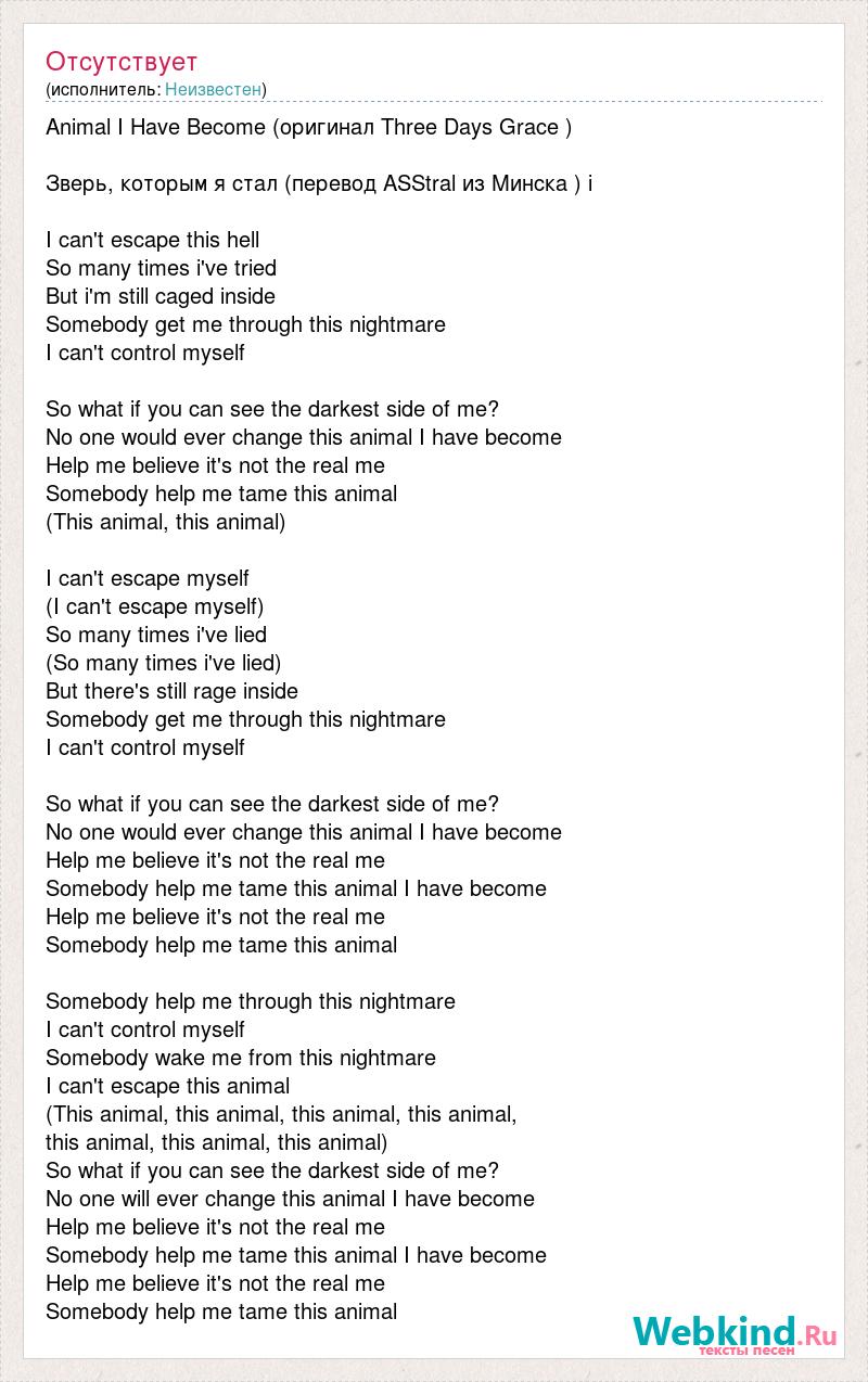 Animal I Have Become (оригинал Three Days Grace ) Зверь, которым я стал (перевод ASStral из Минска ) i I can't escape this hell So many times i've tried But i'm still caged inside Somebody get me through this nightmare I can't control myself So what if you can see the darkest side of me? No one would ever change this animal I have become Help me believe it's not the real me Somebody help me tame this animal (This animal, this animal) I can't escape myself (I can't escape myself) So many times i've lied (So many times i've lied) But there's still rage inside Somebody get me through this nightmare I can't control myself So what if you can see the darkest side of me? No one would ever change this animal I have become Help me believe it's not the real me Somebody help me tame this animal I have become Help me believe it's not the real me Somebody help me tame this animal Somebody help me through this nightmare I can't control myself Somebody wake me from this nightmare I can't escape this animal (This animal, this animal, this animal, this animal, this animal, this animal, this animal) So what if you can see the darkest side of me? No one will ever change this animal I have become Help me believe it's not the real me Somebody help me tame this animal I have become Help me believe it's not the real me Somebody help me tame this animal