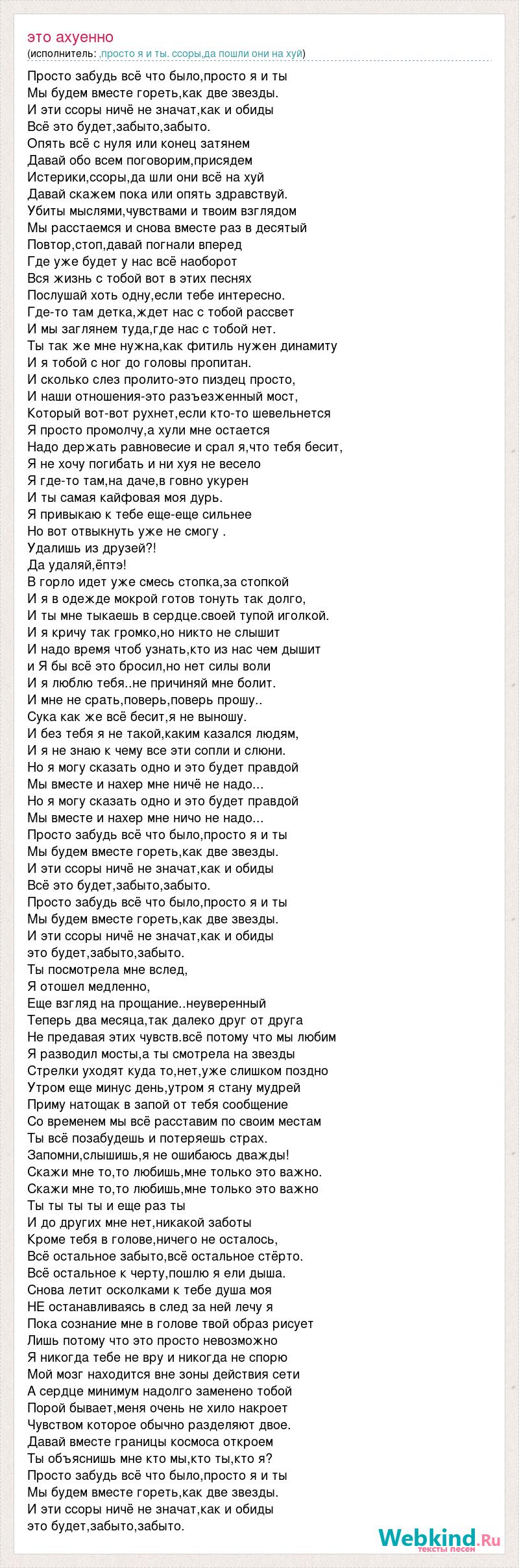 Просто забудь всё что было,просто я и ты Мы будем вместе гореть,как две звезды. И эти ссоры ничё не значат,как и обиды Всё это будет,забыто,забыто. Опять всё с нуля или конец затянем Давай обо всем поговорим,присядем Истерики,ссоры,да шли они всё на хуй Давай скажем пока или опять здравствуй. Убиты мыслями,чувствами и твоим взглядом Мы расстаемся и снова вместе раз в десятый Повтор,стоп,давай погнали вперед Где уже будет у нас всё наоборот Вся жизнь с тобой вот в этих песнях Послушай хоть одну,если тебе интересно. Где-то там детка,ждет нас с тобой рассвет И мы заглянем туда,где нас с тобой нет. Ты так же мне нужна,как фитиль нужен динамиту И я тобой с ног до головы пропитан. И сколько слез пролито-это пиздец просто, И наши отношения-это разъезженный мост, Который вот-вот рухнет,если кто-то шевельнется Я просто промолчу,а хули мне остается Надо держать равновесие и срал я,что тебя бесит, Я не хочу погибать и ни хуя не весело Я где-то там,на даче,в говно укурен И ты самая кайфовая моя дурь. Я привыкаю к тебе еще-еще сильнее Но вот отвыкнуть уже не смогу . Удалишь из друзей?! Да удаляй,ёптэ! В горло идет уже смесь стопка,за стопкой И я в одежде мокрой готов тонуть так долго, И ты мне тыкаешь в сердце.своей тупой иголкой. И я кричу так громко,но никто не слышит И надо время чтоб узнать,кто из нас чем дышит и Я бы всё это бросил,но нет силы воли И я люблю тебя..не причиняй мне болит. И мне не срать,поверь,поверь прошу.. Сука как же всё бесит,я не выношу. И без тебя я не такой,каким казался людям, И я не знаю к чему все эти сопли и слюни. Но я могу сказать одно и это будет правдой Мы вместе и нахер мне ничё не надо... Но я могу сказать одно и это будет правдой Мы вместе и нахер мне ничо не надо... Просто забудь всё что было,просто я и ты Мы будем вместе гореть,как две звезды. И эти ссоры ничё не значат,как и обиды Всё это будет,забыто,забыто. Просто забудь всё что было,просто я и ты Мы будем вместе гореть,как две звезды. И эти ссоры ничё не значат,как и обиды это будет,забыто,забыто. Ты посмотрела мне вслед, Я отошел медленно, Еще взгляд на прощание..неуверенный Теперь два месяца,так далеко друг от друга Не предавая этих чувств.всё потому что мы любим Я разводил мосты,а ты смотрела на звезды Стрелки уходят куда то,нет,уже слишком поздно Утром еще минус день,утром я стану мудрей Приму натощак в запой от тебя сообщение Со временем мы всё расставим по своим местам Ты всё позабудешь и потеряешь страх. Запомни,слышишь,я не ошибаюсь дважды! Скажи мне то,то любишь,мне только это важно. Скажи мне то,то любишь,мне только это важно Ты ты ты ты и еще раз ты И до других мне нет,никакой заботы Кроме тебя в голове,ничего не осталось, Всё остальное забыто,всё остальное стёрто. Всё остальное к черту,пошлю я ели дыша. Снова летит осколками к тебе душа моя НЕ останавливаясь в след за ней лечу я Пока сознание мне в голове твой образ рисует Лишь потому что это просто невозможно Я никогда тебе не вру и никогда не спорю Мой мозг находится вне зоны действия сети А сердце минимум надолго заменено тобой Порой бывает,меня очень не хило накроет Чувством которое обычно разделяют двое. Давай вместе границы космоса откроем Ты объяснишь мне кто мы,кто ты,кто я? Просто забудь всё что было,просто я и ты Мы будем вместе гореть,как две звезды. И эти ссоры ничё не значат,как и обиды это будет,забыто,забыто.