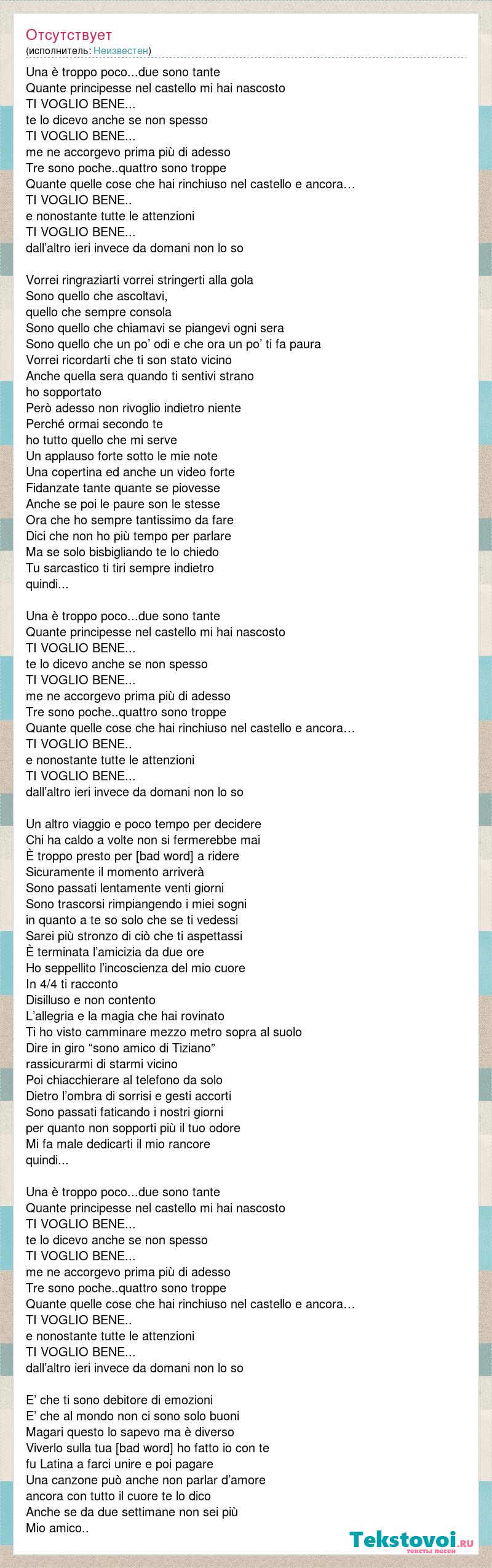 Una è troppo poco...due sono tante Quante principesse nel castello mi hai nascosto TI VOGLIO BENE... te lo dicevo anche se non spesso TI VOGLIO BENE... me ne accorgevo prima più di adesso Tre sono poche..quattro sono troppe Quante quelle cose che hai rinchiuso nel castello e ancora… TI VOGLIO BENE.. e nonostante tutte le attenzioni TI VOGLIO BENE... dall’altro ieri invece da domani non lo so Vorrei ringraziarti vorrei stringerti alla gola Sono quello che ascoltavi, quello che sempre consola Sono quello che chiamavi se piangevi ogni sera Sono quello che un po’ odi e che ora un po’ ti fa paura Vorrei ricordarti che ti son stato vicino Anche quella sera quando ti sentivi strano ho sopportato Però adesso non rivoglio indietro niente Perché ormai secondo te ho tutto quello che mi serve Un applauso forte sotto le mie note Una copertina ed anche un video forte Fidanzate tante quante se piovesse Anche se poi le paure son le stesse Ora che ho sempre tantissimo da fare Dici che non ho più tempo per parlare Ma se solo bisbigliando te lo chiedo Tu sarcastico ti tiri sempre indietro quindi... Una è troppo poco...due sono tante Quante principesse nel castello mi hai nascosto TI VOGLIO BENE... te lo dicevo anche se non spesso TI VOGLIO BENE... me ne accorgevo prima più di adesso Tre sono poche..quattro sono troppe Quante quelle cose che hai rinchiuso nel castello e ancora… TI VOGLIO BENE.. e nonostante tutte le attenzioni TI VOGLIO BENE... dall’altro ieri invece da domani non lo so Un altro viaggio e poco tempo per decidere Chi ha caldo a volte non si fermerebbe mai È troppo presto per ricominciare a ridere Sicuramente il momento arriverà Sono passati lentamente venti giorni Sono trascorsi rimpiangendo i miei sogni in quanto a te so solo che se ti vedessi Sarei più stronzo di ciò che ti aspettassi È terminata l’amicizia da due ore Ho seppellito l’incoscienza del mio cuore In 4/4 ti racconto Disilluso e non contento L’allegria e la magia che hai rovinato Ti ho visto camminare mezzo metro sopra al suolo Dire in giro “sono amico di Tiziano” rassicurarmi di starmi vicino Poi chiacchierare al telefono da solo Dietro l’ombra di sorrisi e gesti accorti Sono passati faticando i nostri giorni per quanto non sopporti più il tuo odore Mi fa male dedicarti il mio rancore quindi... Una è troppo poco...due sono tante Quante principesse nel castello mi hai nascosto TI VOGLIO BENE... te lo dicevo anche se non spesso TI VOGLIO BENE... me ne accorgevo prima più di adesso Tre sono poche..quattro sono troppe Quante quelle cose che hai rinchiuso nel castello e ancora… TI VOGLIO BENE.. e nonostante tutte le attenzioni TI VOGLIO BENE... dall’altro ieri invece da domani non lo so E’ che ti sono debitore di emozioni E’ che al mondo non ci sono solo buoni Magari questo lo sapevo ma è diverso Viverlo sulla tua pelle come ho fatto io con te fu Latina a farci unire e poi pagare Una canzone può anche non parlar d’amore ancora con tutto il cuore te lo dico Anche se da due settimane non sei più Mio amico..