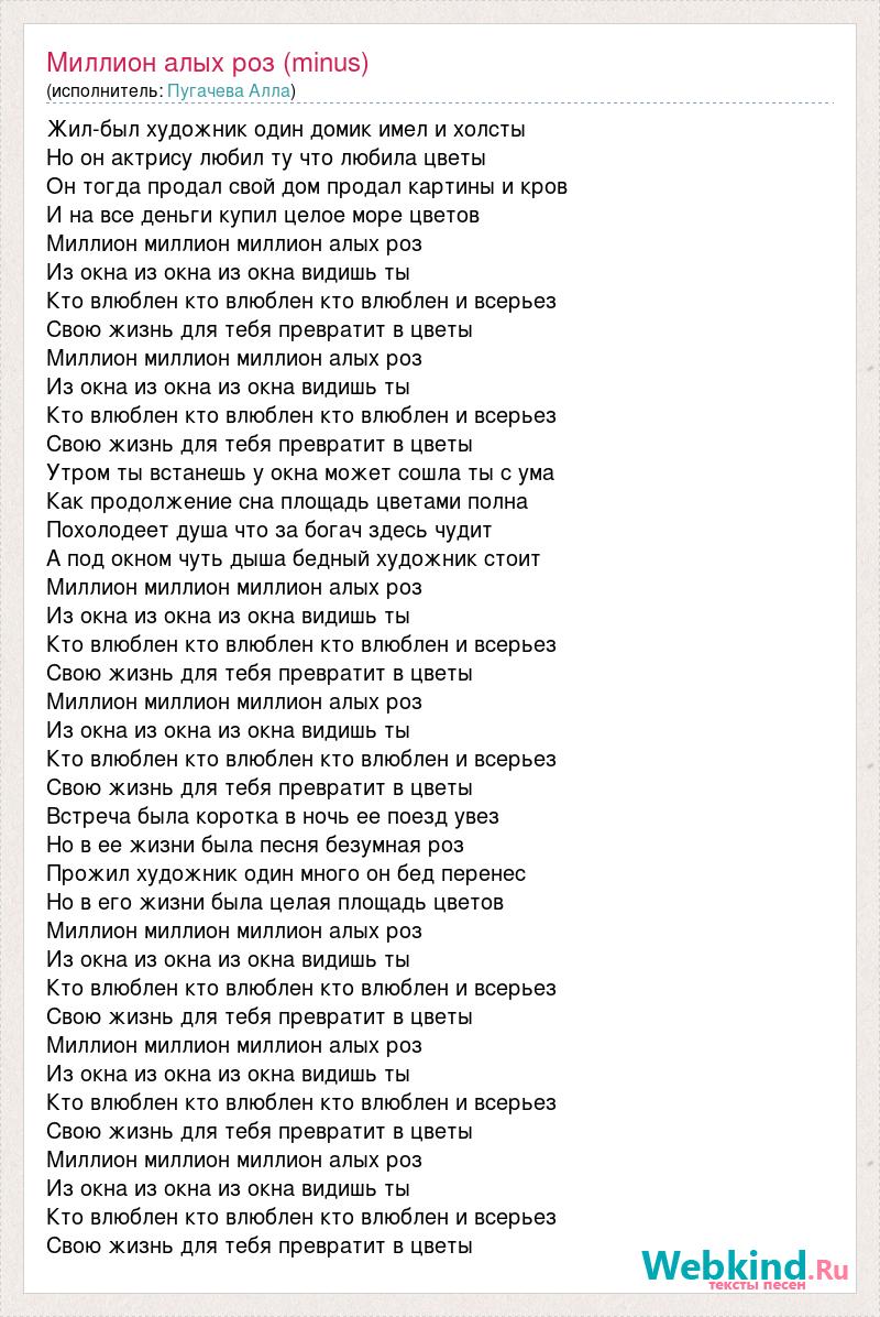 Жил-был художник один домик имел и холсты Но он актрису любил ту что любила цветы Он тогда продал свой дом продал картины и кров И на все деньги купил целое море цветов Миллион миллион миллион алых роз Из окна из окна из окна видишь ты Кто влюблен кто влюблен кто влюблен и всерьез Свою жизнь для тебя превратит в цветы Миллион миллион миллион алых роз Из окна из окна из окна видишь ты Кто влюблен кто влюблен кто влюблен и всерьез Свою жизнь для тебя превратит в цветы Утром ты встанешь у окна может сошла ты с ума Как продолжение сна площадь цветами полна Похолодеет душа что за богач здесь чудит А под окном чуть дыша бедный художник стоит Миллион миллион миллион алых роз Из окна из окна из окна видишь ты Кто влюблен кто влюблен кто влюблен и всерьез Свою жизнь для тебя превратит в цветы Миллион миллион миллион алых роз Из окна из окна из окна видишь ты Кто влюблен кто влюблен кто влюблен и всерьез Свою жизнь для тебя превратит в цветы Встреча была коротка в ночь ее поезд увез Но в ее жизни была песня безумная роз Прожил художник один много он бед перенес Но в его жизни была целая площадь цветов Миллион миллион миллион алых роз Из окна из окна из окна видишь ты Кто влюблен кто влюблен кто влюблен и всерьез Свою жизнь для тебя превратит в цветы Миллион миллион миллион алых роз Из окна из окна из окна видишь ты Кто влюблен кто влюблен кто влюблен и всерьез Свою жизнь для тебя превратит в цветы Миллион миллион миллион алых роз Из окна из окна из окна видишь ты Кто влюблен кто влюблен кто влюблен и всерьез Свою жизнь для тебя превратит в цветы