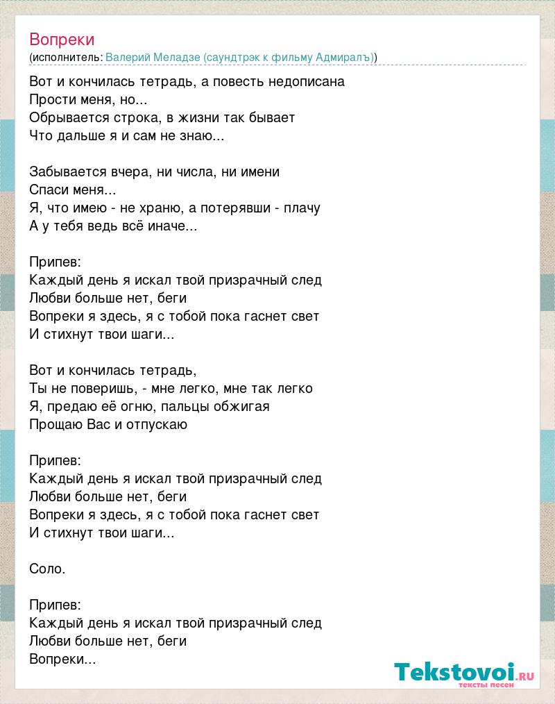 Вот и кончилась тетрадь, а повесть недописана Прости меня, но... Обрывается строка, в жизни так бывает Что дальше я и сам не знаю... Забывается вчера, ни числа, ни имени Спаси меня... Я, что имею - не храню, а потерявши - плачу А у тебя ведь всё иначе... Припев: Каждый день я искал твой призрачный след Любви больше нет, беги Вопреки я здесь, я с тобой пока гаснет свет И стихнут твои шаги... Вот и кончилась тетрадь, Ты не поверишь, - мне легко, мне так легко Я, предаю её огню, пальцы обжигая Прощаю Вас и отпускаю Припев: Каждый день я искал твой призрачный след Любви больше нет, беги Вопреки я здесь, я с тобой пока гаснет свет И стихнут твои шаги... Соло. Припев: Каждый день я искал твой призрачный след Любви больше нет, беги Вопреки...