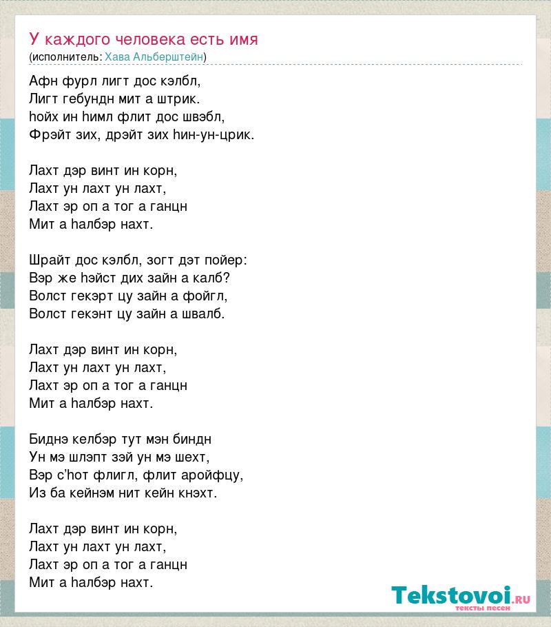 Афн фурл лигт дос кэлбл, Лигт гебундн мит а штрик. hойх ин hимл флит дос швэбл, Фрэйт зих, дрэйт зих hин-ун-црик. Лахт дэр винт ин корн, Лахт ун лахт ун лахт, Лахт эр оп а тог а ганцн Мит а hалбэр нахт. Шрайт дос кэлбл, зогт дэт пойер: Вэр же hэйст дих зайн а калб? Волст гекэрт цу зайн а фойгл, Волст гекэнт цу зайн а швалб. Лахт дэр винт ин корн, Лахт ун лахт ун лахт, Лахт эр оп а тог а ганцн Мит а hалбэр нахт. Биднэ келбэр тут мэн биндн Ун мэ шлэпт зэй ун мэ шехт, Вэр с’hот флигл, флит аройфцу, Из ба кейнэм нит кейн кнэхт. Лахт дэр винт ин корн, Лахт ун лахт ун лахт, Лахт эр оп а тог а ганцн Мит а hалбэр нахт.