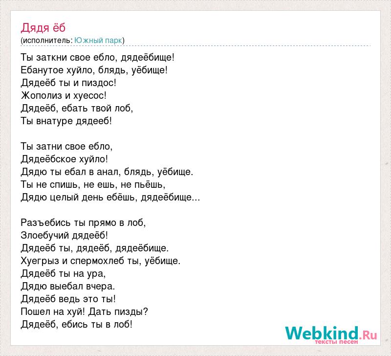 Ты заткни свое ебло, дядеёбище! Ебанутое хуйло, блядь, уёбище! Дядеёб ты и пиздос! Жополиз и хуесос! Дядеёб, ебать твой лоб, Ты внатуре дядееб! Ты затни свое ебло, Дядеёбское хуйло! Дядю ты ебал в анал, блядь, уёбище. Ты не спишь, не ешь, не пьёшь, Дядю целый день ебёшь, дядеёбище... Разъебись ты прямо в лоб, Злоебучий дядеёб! Дядеёб ты, дядеёб, дядеёбище. Хуегрыз и спермохлеб ты, уёбище. Дядеёб ты на ура, Дядю выебал вчера. Дядеёб ведь это ты! Пошел на хуй! Дать пизды? Дядеёб, ебись ты в лоб!